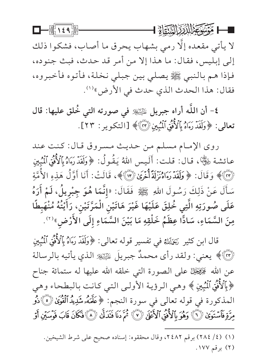 ٤ - أن اللَّه أراه جبريل - عليه السلام - في صورته التي خُلق عليها: قال تعالى: {وَلَقَدْ رَأَىهُ بِالْأُفُقِ الْمُبِينِ (٢٣)} [التكوير: ٢٣].