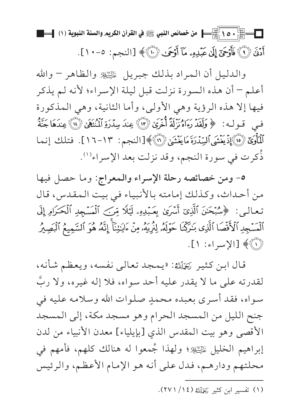 ٥ - ومن خصائصه رحلة الإسراء والمعراج: وما حصل فيها من أحداث، وكذلك إمامته بالأنبياء في بيت المقدس، قال تعالى: {سُبْحَانَ الَّذِي أَسْرَى بِعَبْدِهِ لَيْلًا مِنَ الْمَسْجِدِ الْحَرَامِ إِلَى الْمَسْجِدِ الْأَقْصَى الَّذِي بَارَكْنَا حَوْلَهُ لِنُرِيَهُ مِنْ آيَاتِنَا إِنَّهُ هُوَ السَّمِيعُ الْبَصِيرُ (١)} [الإسراء: ١].
