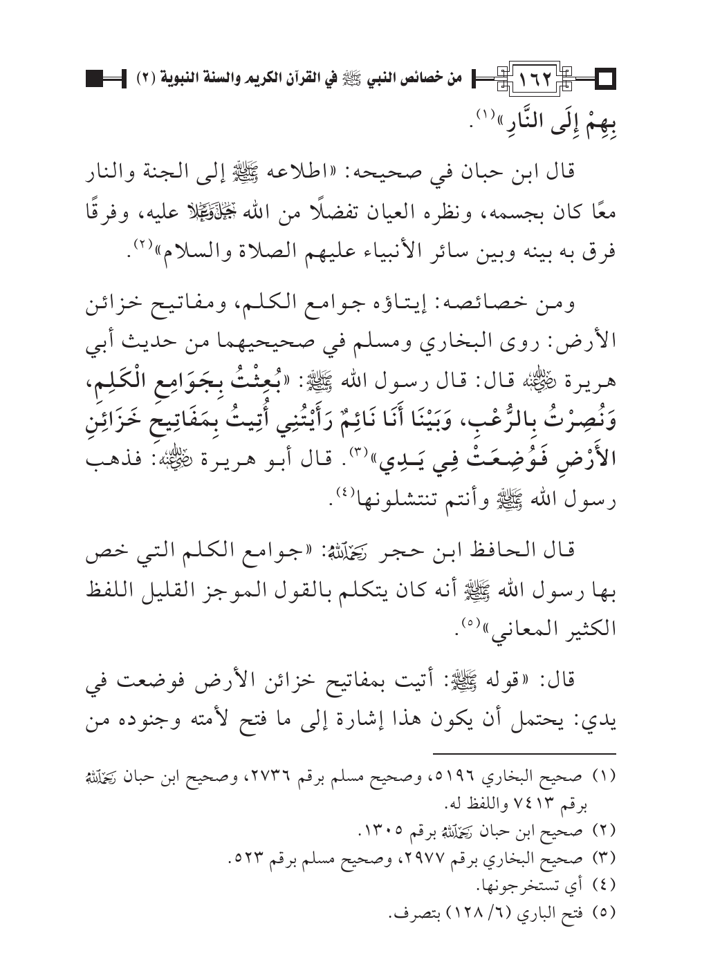 ومن خصائصه: إيتاؤه جوامع الكلم، ومفاتيح خزائن الأرض: روى البخاري ومسلم في صحيحيهما من حديث أبي هريرة -رضي الله عنه- قال: قال رسول الله - صلى الله عليه وسلم -: «بُعِثْتُ بِجَوَامِعِ الْكَلِمِ، وَنُصِرْتُ بِالرُّعْبِ، وَبَيْنَا أَنَا نَائِمٌ رَأَيْتُنِي أُتِيتُ بِمَفَاتِيحِ خَزَائِنِ الأَرْضِ فَوُضِعَتْ فِي يَدِي» (¬٣). قال أبو هريرة -رضي الله عنه-: فذهب رسول الله - صلى الله عليه وسلم - وأنتم تنتشلونها (¬٤).
