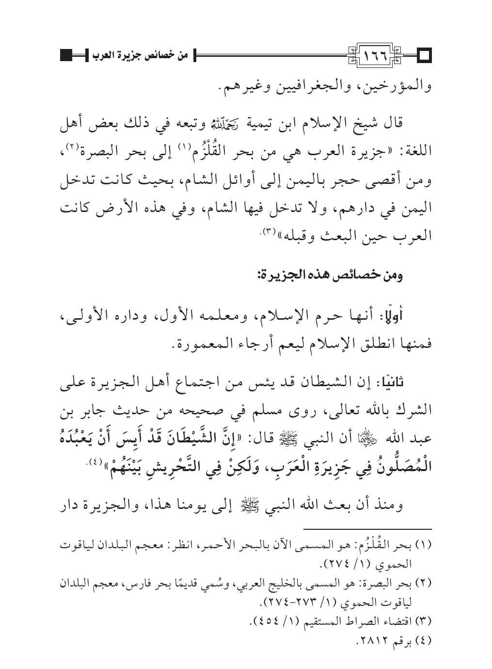 قال شيخ الإسلام ابن تيمية - رحمه الله - وتبعه في ذلك بعض أهل اللغة: «جزيرة العرب هي من بحر القُلْزُم (¬١) إلى بحر البصرة (¬٢)، ومن أقصى حجر باليمن إلى أوائل الشام، بحيث كانت تدخل اليمن في دارهم، ولا تدخل فيها الشام، وفي هذه الأرض كانت العرب حين البعث وقبله» (¬٣).