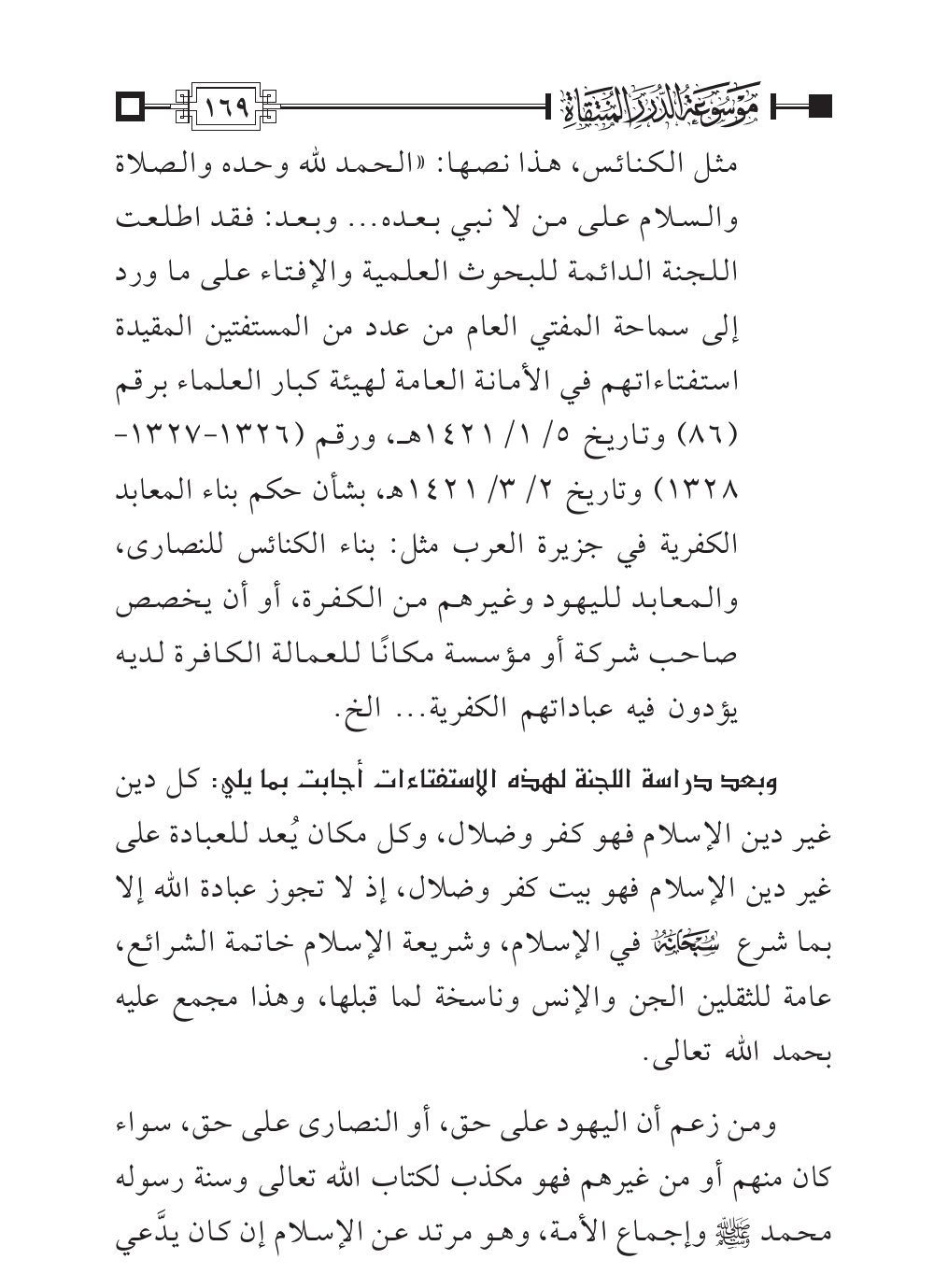 مثل الكنائس، هذا نصها: «الحمد لله وحده والصلاة والسلام على من لا نبي بعده ... وبعد: فقد اطلعت اللجنة الدائمة للبحوث العلمية والإفتاء على ما ورد إلى سماحة المفتي العام من عدد من المستفتين المقيدة استفتاءاتهم في الأمانة العامة لهيئة كبار العلماء برقم (٨٦) وتاريخ ٥/ ١/ ١٤٢١ هـ، ورقم (١٣٢٦ - ١٣٢٧ - ١٣٢٨) وتاريخ ٢/ ٣/١٤٢١ هـ، بشأن حكم بناء المعابد الكفرية في جزيرة العرب مثل: بناء الكنائس للنصارى، والمعابد لليهود وغيرهم من الكفرة، أو أن يخصص صاحب شركة أو مؤسسة مكانًا للعمالة الكافرة لديه يؤدون فيه عباداتهم الكفرية ... الخ.