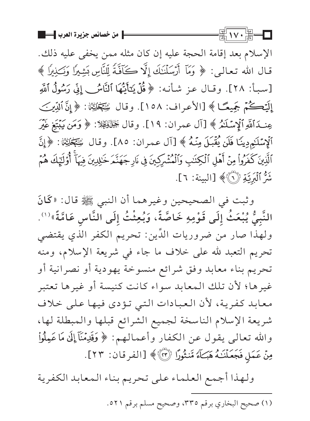 وثبت في الصحيحين وغيرهما أن النبي - صلى الله عليه وسلم - قال: «كَانَ النَّبِيُّ يُبْعَثُ إِلَى قَوْمِهِ خَاصَّةً، وَبُعِثْتُ إِلَى النَّاسِ عَامَّةً» (¬١). ولهذا صار من ضروريات الدِّين: تحريم الكفر الذي يقتضي تحريم التعبد لله على خلاف ما جاء في شريعة الإسلام، ومنه تحريم بناء معابد وفق شرائع منسوخة يهودية أو نصرانية أو غيرها؛ لأن تلك المعابد سواء كانت كنيسة أو غيرها تعتبر معابد كفرية، لأن العبادات التي تؤدى فيها على خلاف شريعة الإسلام الناسخة لجميع الشرائع قبلها والمبطلة لها، والله تعالى يقول عن الكفار وأعمالهم: {وَقَدِمْنَا إِلَى مَا عَمِلُوا مِنْ عَمَلٍ فَجَعَلْنَاهُ هَبَاءً مَنْثُورًا (٢٣)} [الفرقان: ٢٣].