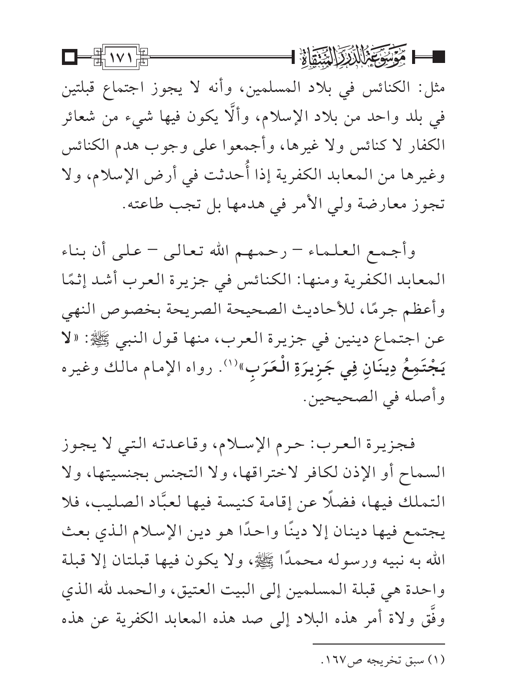 فجزيرة العرب: حرم الإسلام، وقاعدته التي لا يجوز السماح أو الإذن لكافر لاختراقها، ولا التجنس بجنسيتها، ولا التملك فيها، فضلًا عن إقامة كنيسة فيها لعبَّاد الصليب، فلا يجتمع فيها دينان إلا دينًا واحدًا هو دين الإسلام الذي بعث الله به نبيه ورسوله محمدًا - صلى الله عليه وسلم -، ولا يكون فيها قبلتان إلا قبلة واحدة هي قبلة المسلمين إلى البيت العتيق، والحمد لله الذي وفَّق ولاة أمر هذه البلاد إلى صد هذه المعابد الكفرية عن هذه