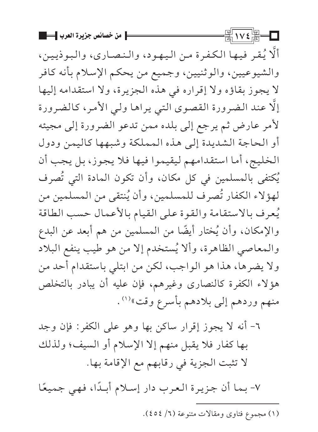 ألَّا يُقر فيها الكفرة من اليهود، والنصارى، والبوذيين، والشيوعيين، والوثنيين، وجميع من يحكم الإسلام بأنه كافر لا يجوز بقاؤه ولا إقراره في هذه الجزيرة، ولا استقدامه إليها إلَّا عند الضرورة القصوى التي يراها ولي الأمر، كالضرورة لأمر عارض ثم يرجع إلى بلده ممن تدعو الضرورة إلى مجيئه أو الحاجة الشديدة إلى هذه المملكة وشبهها كاليمن ودول الخليج، أما استقدامهم ليقيموا فيها فلا يجوز، بل يجب أن يُكتفى بالمسلمين في كل مكان، وأن تكون المادة التي تُصرف لهؤلاء الكفار تُصرف للمسلمين، وأن يُنتقى من المسلمين من يُعرف بالاستقامة والقوة على القيام بالأعمال حسب الطاقة والإمكان، وأن يُختار أيضًا من المسلمين من هم أبعد عن البدع والمعاصي الظاهرة، وألا يُستخدم إلا من هو طيب ينفع البلاد ولا يضرها، هذا هو الواجب، لكن من ابتلي باستقدام أحد من هؤلاء الكفرة كالنصارى وغيرهم، فإن عليه أن يبادر بالتخلص منهم وردهم إلى بلادهم بأسرع وقت» (¬١).