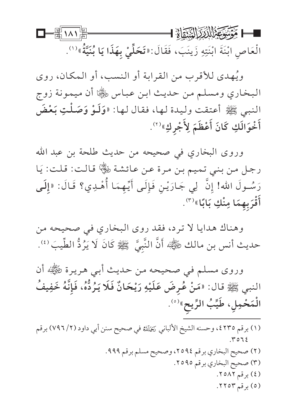وهناك هدايا لا ترد، فقد روى البخاري في صحيحه من حديث أنس بن مالك - رضي الله عنه - أَنَّ النَّبِيَّ - صلى الله عليه وسلم - كَانَ لَا يَرُدُّ الطِّيبَ (¬٤).