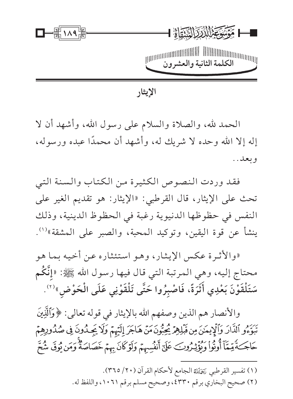 فقد وردت النصوص الكثيرة من الكتاب والسنة التي تحث على الإيثار، قال القرطبي: «الإيثار: هو تقديم الغير على النفس في حظوظها الدنيوية رغبة في الحظوظ الدينية، وذلك ينشأ عن قوة اليقين، وتوكيد المحبة، والصبر على المشقة» (¬١).