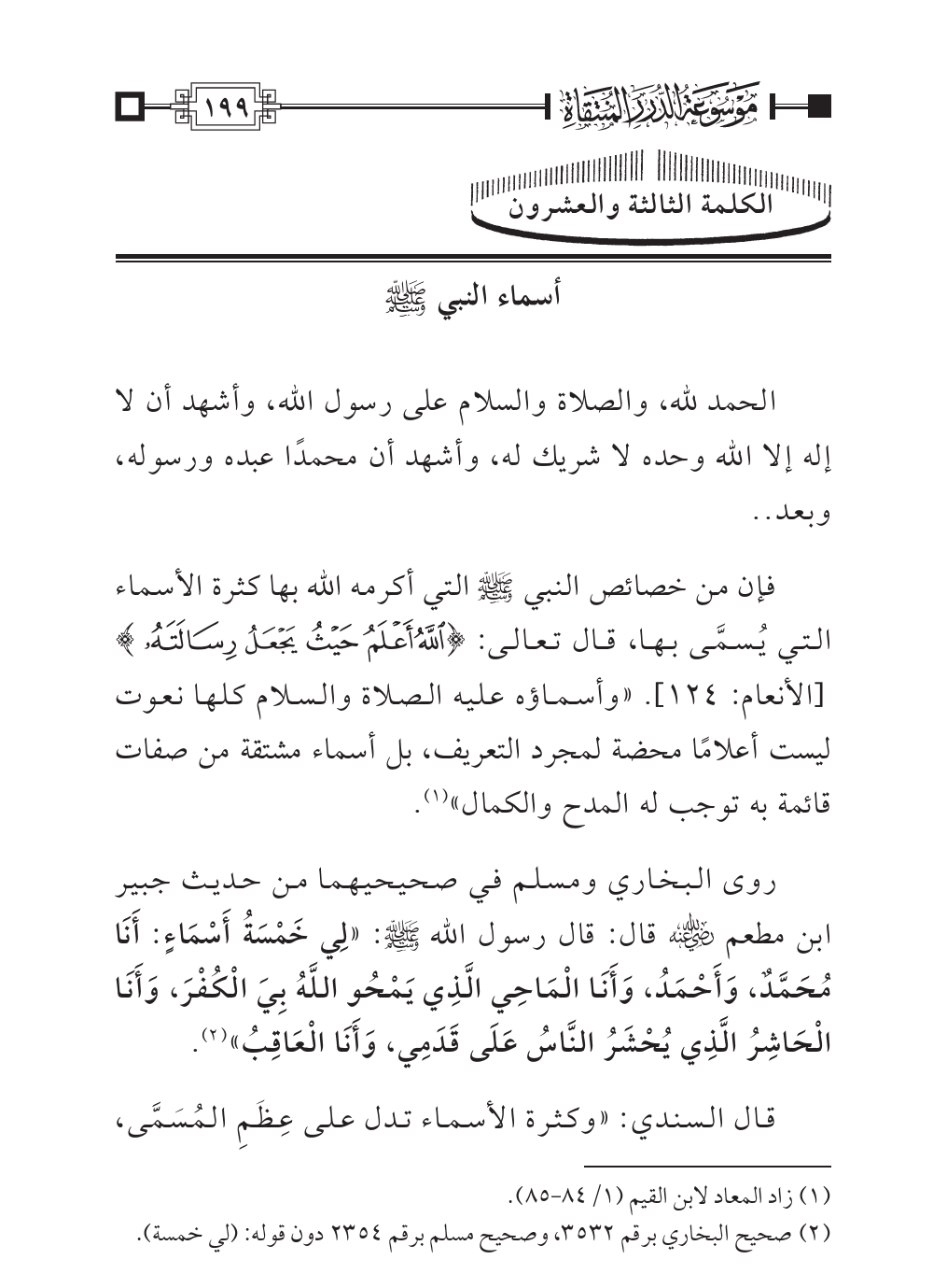 فإن من خصائص النبي - صلى الله عليه وسلم - التي أكرمه الله بها كثرة الأسماء التي يُسمَّى بها، قال تعالى: {اللَّهُ أَعْلَمُ حَيْثُ يَجْعَلُ رِسَالَتَهُ} [الأنعام: ١٢٤]. «وأسماؤه عليه الصلاة والسلام كلها نعوت ليست أعلامًا محضة لمجرد التعريف، بل أسماء مشتقة من صفات قائمة به توجب له المدح والكمال» (¬١).
