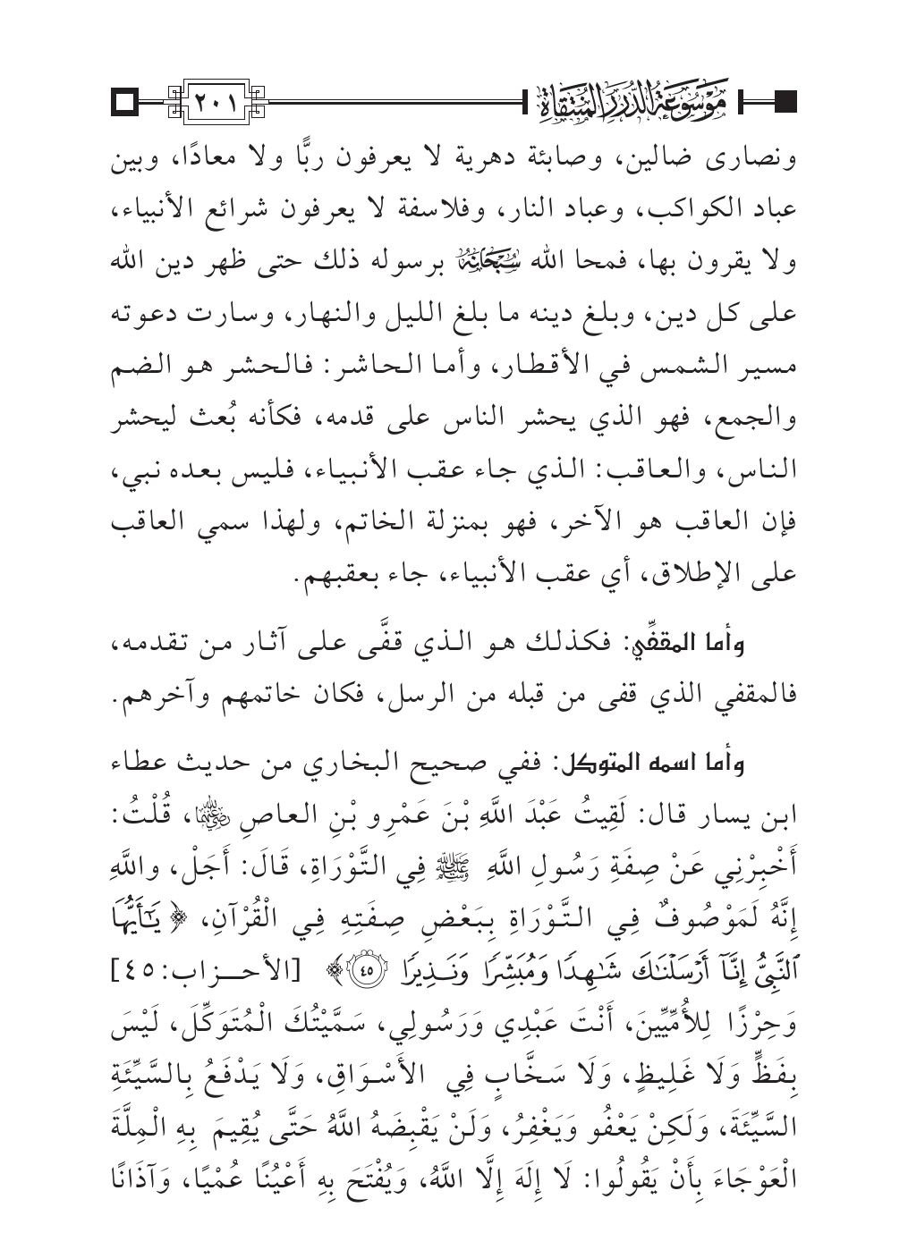 ونصارى ضالين، وصابئة دهرية لا يعرفون ربًّا ولا معادًا، وبين عباد الكواكب، وعباد النار، وفلاسفة لا يعرفون شرائع الأنبياء، ولا يقرون بها، فمحا الله -سُبْحَانَهُ- برسوله ذلك حتى ظهر دين الله على كل دين، وبلغ دينه ما بلغ الليل والنهار، وسارت دعوته مسير الشمس في الأقطار، وأما الحاشر: فالحشر هو الضم والجمع، فهو الذي يحشر الناس على قدمه، فكأنه بُعث ليحشر الناس، والعاقب: الذي جاء عقب الأنبياء، فليس بعده نبي، فإن العاقب هو الآخر، فهو بمنزلة الخاتم، ولهذا سمي العاقب على الإطلاق، أي عقب الأنبياء، جاء بعقبهم.
