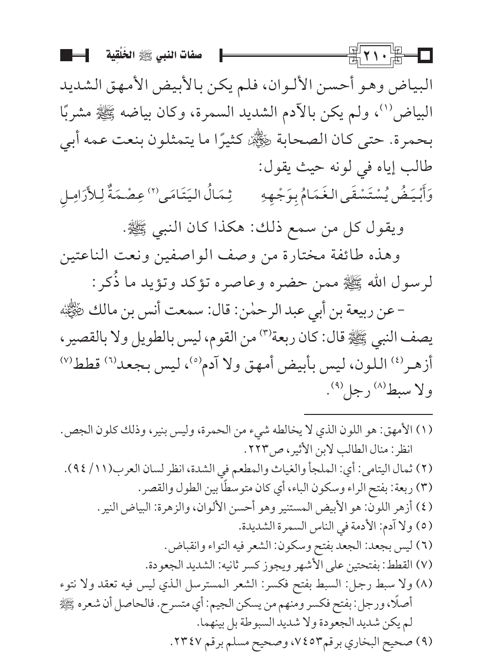 ولم يكن بالآدم الشديد السمرة، وكان بياضه - صلى الله عليه وسلم - مشربًا بحمرة. حتى كان الصحابة - رضي الله عنهم - كثيرًا ما يتمثلون بنعت عمه أبي طالب إياه في لونه حيث يقول: