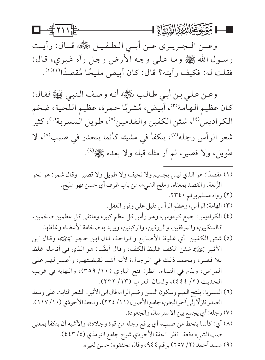 وعن علي بن أبي طالب - رضي الله عنه - أنه وصف النبي - صلى الله عليه وسلم - فقال: كان عظيم الهامة (¬٣)، أبيض، مُشربًا حمرة، عظيم اللحية، ضخم الكراديس (¬٤)، شثن الكفين والقدمين (¬٥)، طويل المسربة (¬٦)، كثير شعر الرأس رجله (¬٧)، يتكفأ في مشيته كأنما ينحدر في صبب (¬٨)، لا طويل، ولا قصير، لم أر مثله قبله ولا بعده - صلى الله عليه وسلم - (¬٩).