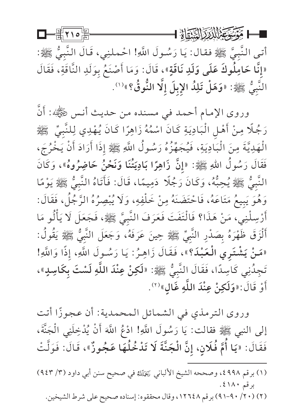 وروى الإمام أحمد في مسنده من حديث أنس - رضي الله عنه -: أَنَّ رَجُلًا مِنْ أَهْلِ الْبَادِيَةِ كَانَ اسْمُهُ زَاهِرًا كَانَ يُهْدِي لِلنَّبِيِّ - صلى الله عليه وسلم - الْهَدِيَّةَ مِنَ الْبَادِيَةِ، فَيُجَهِّزُهُ رَسُولُ اللَّهِ - صلى الله عليه وسلم - إِذَا أَرَادَ أَنْ يَخْرُجَ، فَقَالَ رَسُولُ اللهِ - صلى الله عليه وسلم -: «إِنَّ زَاهِرًا بَادِيَتُنَا وَنَحْنُ حَاضِرُوهُ»، وَكَانَ النَّبِيُّ - صلى الله عليه وسلم - يُحِبُّهُ، وَكَانَ رَجُلًا دَمِيمًا، قَالَ: فَأَتَاهُ النَّبِيُّ - صلى الله عليه وسلم - يَوْمًا وَهُوَ يَبِيعُ مَتَاعَهُ، فَاحْتَضَنَهُ مِنْ خَلْفِهِ، وَلَا يُبْصِرُهُ الرَّجُلُ، فَقَالَ: أَرْسِلْنِي، مَنْ هَذَا؟ فَالْتَفَتَ فَعَرَفَ النَّبِيَّ - صلى الله عليه وسلم -، فَجَعَلَ لَا يَأْلُو مَا أَلْزَقَ ظَهْرَهُ بِصَدْرِ النَّبِيِّ - صلى الله عليه وسلم - حِينَ عَرَفَهُ، وَجَعَلَ النَّبِيُّ - صلى الله عليه وسلم - يَقُولُ: «مَنْ يَشْتَرِي الْعَبْدَ؟»، فَقَالَ زَاهِرُ: يَا رَسُولَ اللَّهِ، إِذًا وَاللَّهِ! تَجِدُنِي كَاسِدًا، فَقَالَ النَّبِيُّ - صلى الله عليه وسلم -: «لَكِنْ عِنْدَ اللَّهِ لَسْتَ بِكَاسِدٍ»، أَوْ قَالَ: «وَلَكِنْ عِنْدَ اللَّهِ غَالٍ» (¬٢).
