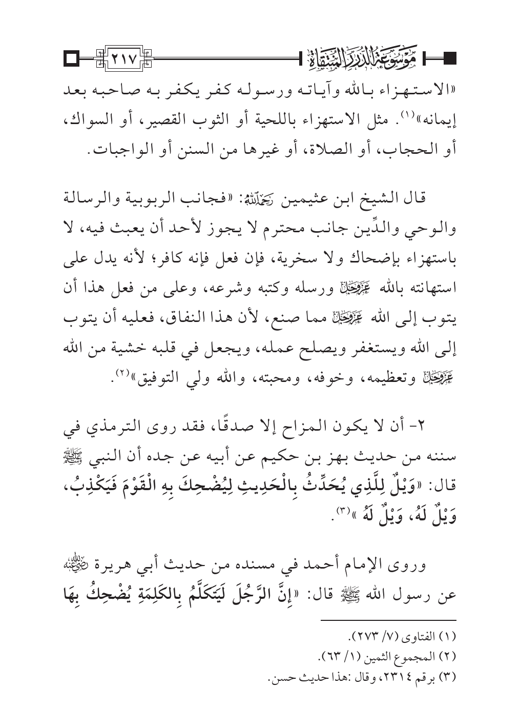 قال الشيخ ابن عثيمين - رحمه الله -: «فجانب الربوبية والرسالة والوحي والدِّين جانب محترم لا يجوز لأحد أن يعبث فيه، لا باستهزاء بإضحاك ولا سخرية، فإن فعل فإنه كافر؛ لأنه يدل على استهانته بالله - عز وجل - ورسله وكتبه وشرعه، وعلى من فعل هذا أن يتوب إلى الله - عز وجل - مما صنع، لأن هذا النفاق، فعليه أن يتوب إلى الله ويستغفر ويصلح عمله، ويجعل في قلبه خشية من الله - عز وجل - وتعظيمه، وخوفه، ومحبته، والله ولي التوفيق» (¬٢).