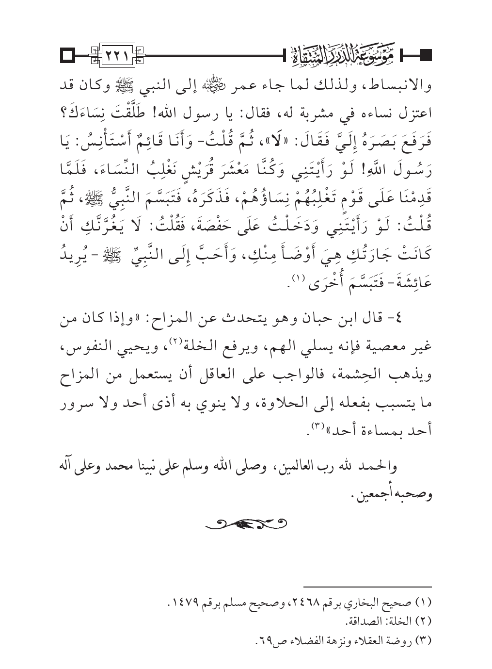 ٤ - قال ابن حبان وهو يتحدث عن المزاح: «وإذا كان من غير معصية فإنه يسلي الهم، ويرفع الخلة (¬٢)، ويحيي النفوس، ويذهب الحِشمة، فالواجب على العاقل أن يستعمل من المزاح ما يتسبب بفعله إلى الحلاوة، ولا ينوي به أذى أحد ولا سرور أحد بمساءة أحد» (¬٣).