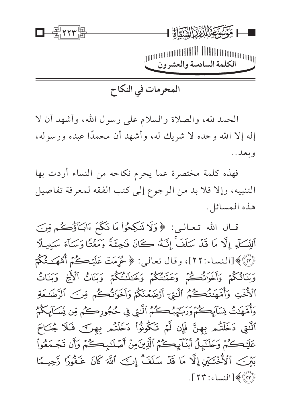 فهذه كلمة مختصرة عما يحرم نكاحه من النساء أردت بها التنبيه، وإلا فلا بد من الرجوع إلى كتب الفقه لمعرفة تفاصيل هذه المسائل.