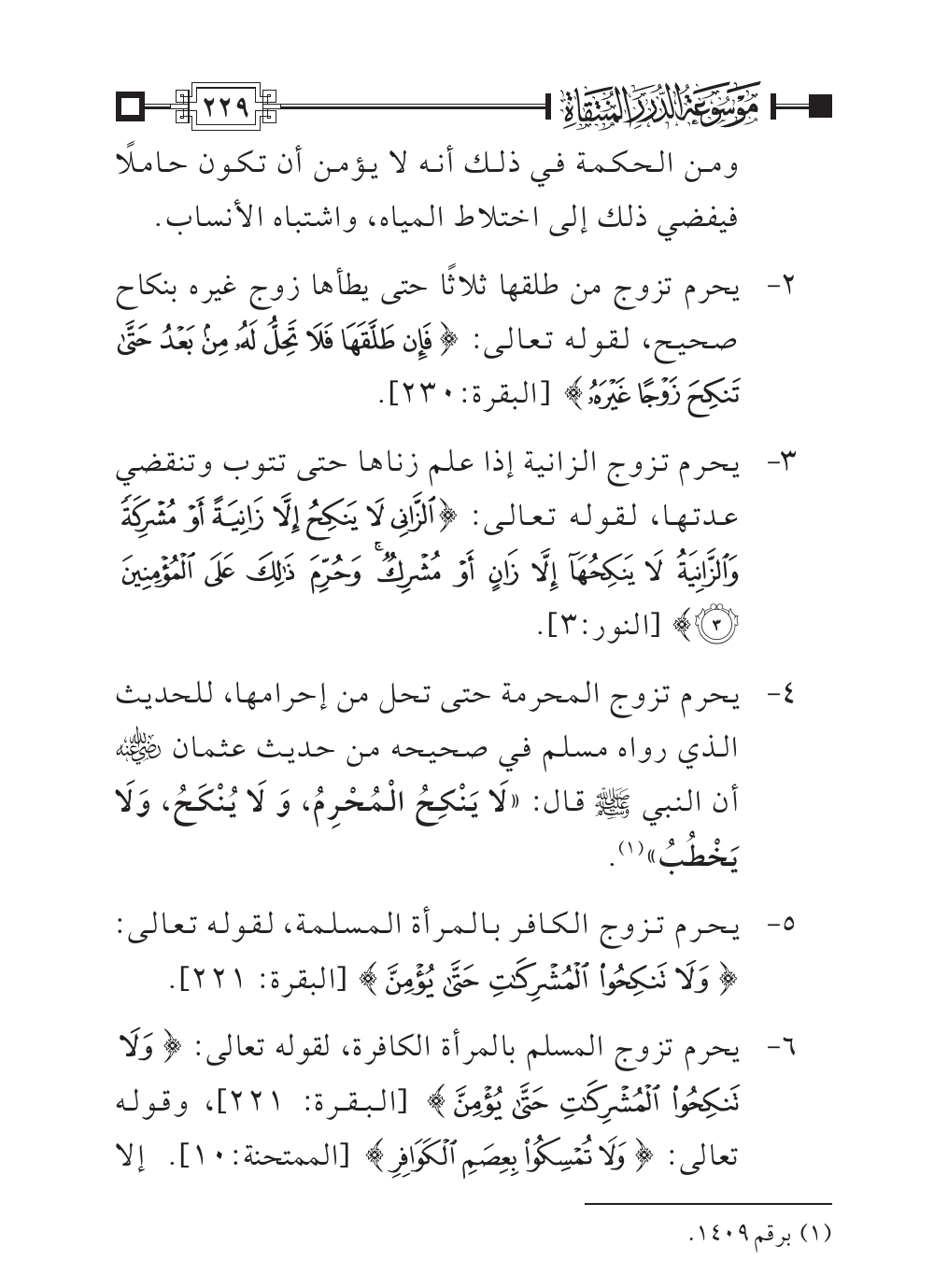 ٦ - يحرم تزوج المسلم بالمرأة الكافرة، لقوله تعالى: {وَلَا تَنْكِحُوا الْمُشْرِكَاتِ حَتَّى يُؤْمِنَّ} [البقرة: ٢٢١]، وقوله تعالى: {وَلَا تُمْسِكُوا بِعِصَمِ الْكَوَافِرِ} [الممتحنة:١٠]. إلا