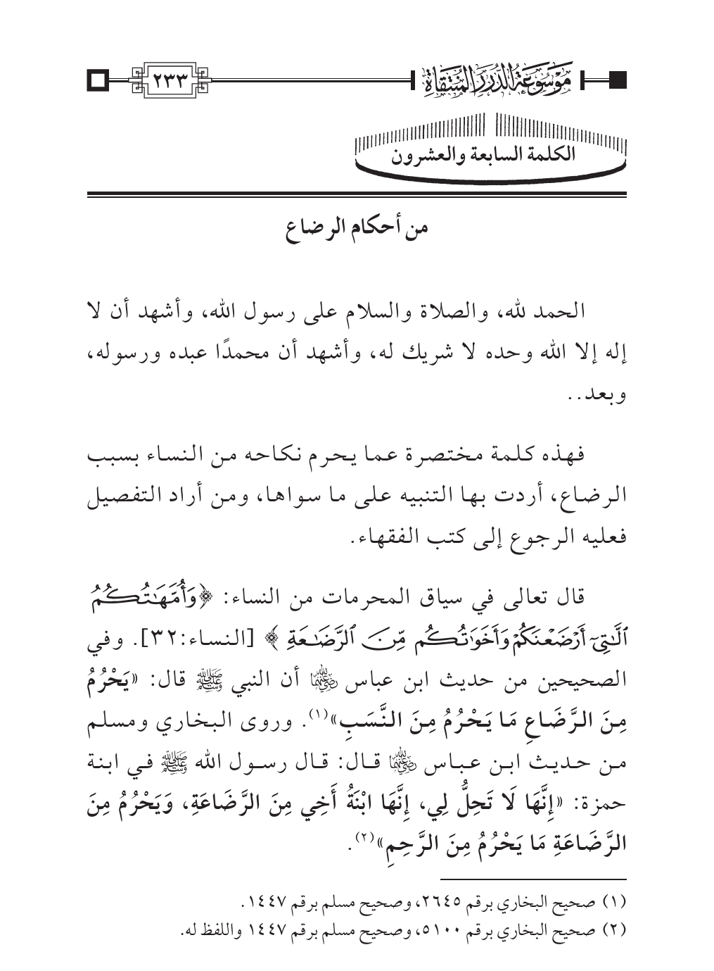 قال تعالى في سياق المحرمات من النساء: {وَأُمَّهَاتُكُمُ اللَّاتِي أَرْضَعْنَكُمْ وَأَخَوَاتُكُمْ مِنَ الرَّضَاعَةِ} [النساء:٢٣]. وفي الصحيحين من حديث ابن عباس - رضي الله عنهما - أن النبي - صلى الله عليه وسلم - قال: «يَحْرُمُ مِنَ الرَّضَاعِ مَا يَحْرُمُ مِنَ النَّسَبِ» (¬١). وروى البخاري ومسلم من حديث ابن عباس - رضي الله عنهما - قال: قال رسول الله - صلى الله عليه وسلم - في ابنة حمزة: «إِنَّهَا لَا تَحِلُّ لِي، إِنَّهَا ابْنَةُ أَخِي مِنَ الرَّضَاعَةِ، وَيَحْرُمُ مِنَ الرَّضَاعَةِ مَا يَحْرُمُ مِنَ الرَّحِمِ» (¬٢).