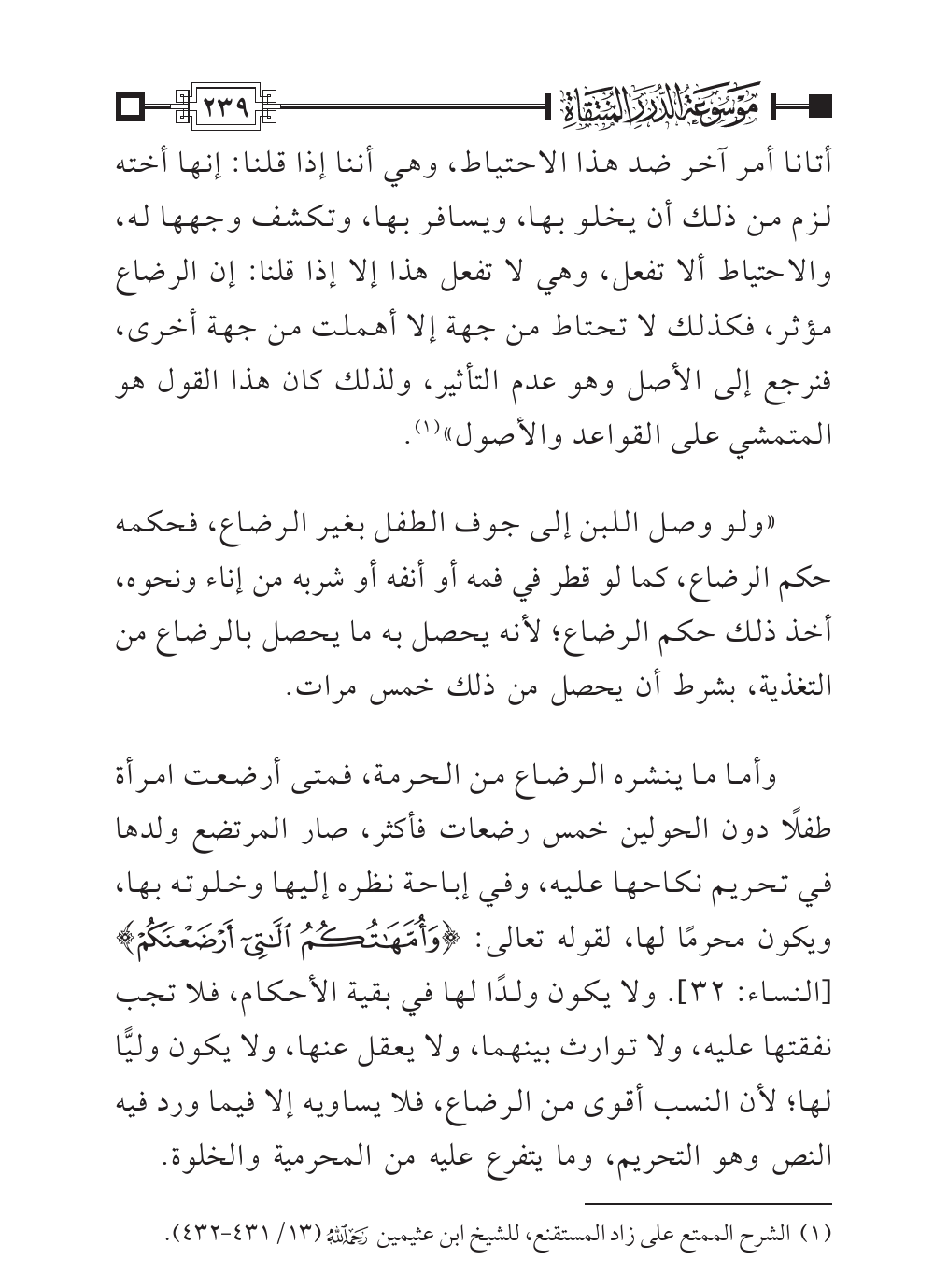 أتانا أمر آخر ضد هذا الاحتياط، وهي أننا إذا قلنا: إنها أخته لزم من ذلك أن يخلو بها، ويسافر بها، وتكشف وجهها له، والاحتياط ألا تفعل، وهي لا تفعل هذا إلا إذا قلنا: إن الرضاع مؤثر، فكذلك لا تحتاط من جهة إلا أهملت من جهة أخرى، فنرجع إلى الأصل وهو عدم التأثير، ولذلك كان هذا القول هو المتمشي على القواعد والأصول» (¬١).