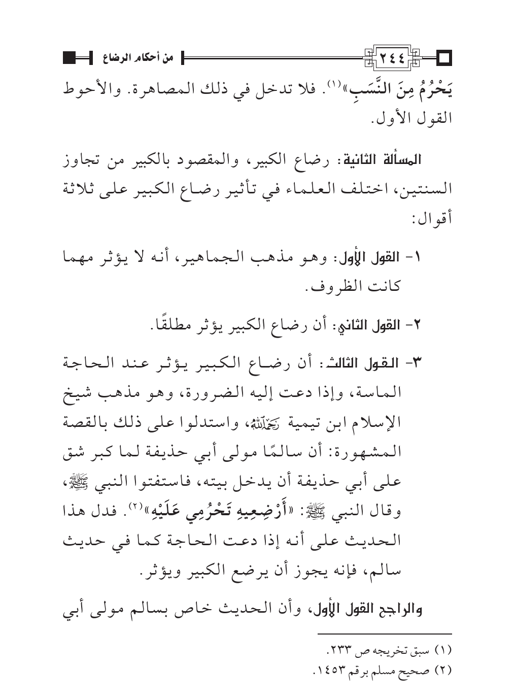 ٣ - القول الثالث: أن رضاع الكبير يؤثر عند الحاجة الماسة، وإذا دعت إليه الضرورة، وهو مذهب شيخ الإسلام ابن تيمية - رحمه الله -، واستدلوا على ذلك بالقصة المشهورة: أن سالمًا مولى أبي حذيفة لما كبر شق على أبي حذيفة أن يدخل بيته، فاستفتوا النبي - صلى الله عليه وسلم -، وقال النبي - صلى الله عليه وسلم -: «أَرْضِعِيهِ تَحْرُمِي عَلَيْهِ» (¬٢). فدل هذا الحديث على أنه إذا دعت الحاجة كما في حديث سالم، فإنه يجوز أن يرضع الكبير ويؤثر.