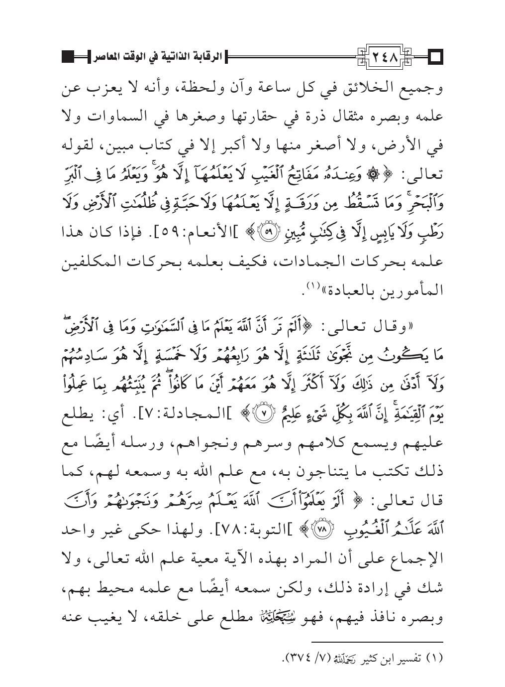 وجميع الخلائق في كل ساعة وآن ولحظة، وأنه لا يعزب عن علمه وبصره مثقال ذرة في حقارتها وصغرها في السماوات ولا في الأرض، ولا أصغر منها ولا أكبر إلا في كتاب مبين، لقوله تعالى: {وَعِنْدَهُ مَفَاتِحُ الْغَيْبِ لَا يَعْلَمُهَا إِلَّا هُوَ وَيَعْلَمُ مَا فِي الْبَرِّ وَالْبَحْرِ وَمَا تَسْقُطُ مِنْ وَرَقَةٍ إِلَّا يَعْلَمُهَا وَلَا حَبَّةٍ فِي ظُلُمَاتِ الْأَرْضِ وَلَا رَطْبٍ وَلَا يَابِسٍ إِلَّا فِي كِتَابٍ مُبِينٍ (٥٩)} [الأنعام:٥٩]. فإذا كان هذا علمه بحركات الجمادات، فكيف بعلمه بحركات المكلفين المأمورين بالعبادة» (¬١).