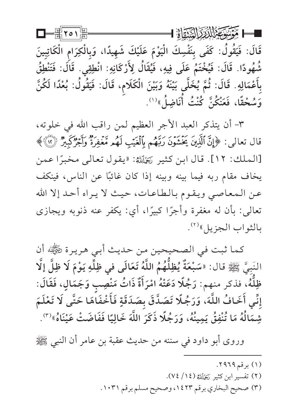 كما ثبت في الصحيحين من حديث أبي هريرة -رضي الله عنه- أن النَبِيَّ - صلى الله عليه وسلم - قال: «سَبْعَةٌ يُظِلُّهُمُ اللَّهُ تَعَالَى في ظِلِّهِ يَوْمَ لَا ظِلَّ إلَّا ظِلُّهُ، فذكر منهم: رَجُلًا دَعَتْهُ امْرَأَةٌ ذَاتُ مَنْصِبٍ وَجَمَالٍ، فَقَالَ: إِنِّي أَخَافُ اللَّهَ، وَرَجُلًا تَصَدَّقَ بِصَدَقَةٍ فَأَخْفَاهَا حَتَّى لَا تَعْلَمَ شِمَالُهُ مَا تُنْفِقُ يَمِينُهُ، وَرَجُلًا ذَكَرَ اللَّهَ خَالِيًا فَفَاضَتْ عَيْنَاهُ» (¬٣).