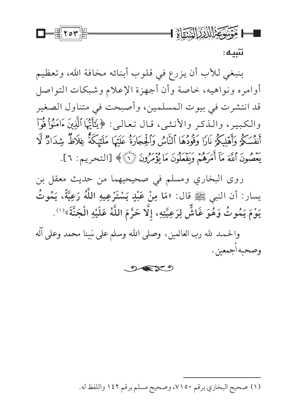 بنبغي للأب أن يزرع في قلوب أبنائه مخافة الله، وتعظيم أوامره ونواهيه، خاصة وأن أجهزة الإعلام وشبكات التواصل قد انتشرت في بيوت المسلمين، وأصبحت في متناول الصغير والكبير، والذكر والأنثى، قال تعالى: {يَاأَيُّهَا الَّذِينَ آمَنُوا قُوا أَنْفُسَكُمْ وَأَهْلِيكُمْ نَارًا وَقُودُهَا النَّاسُ وَالْحِجَارَةُ عَلَيْهَا مَلَائِكَةٌ غِلَاظٌ شِدَادٌ لَا يَعْصُونَ اللَّهَ مَا أَمَرَهُمْ وَيَفْعَلُونَ مَا يُؤْمَرُونَ (٦)} [التحريم: ٦].