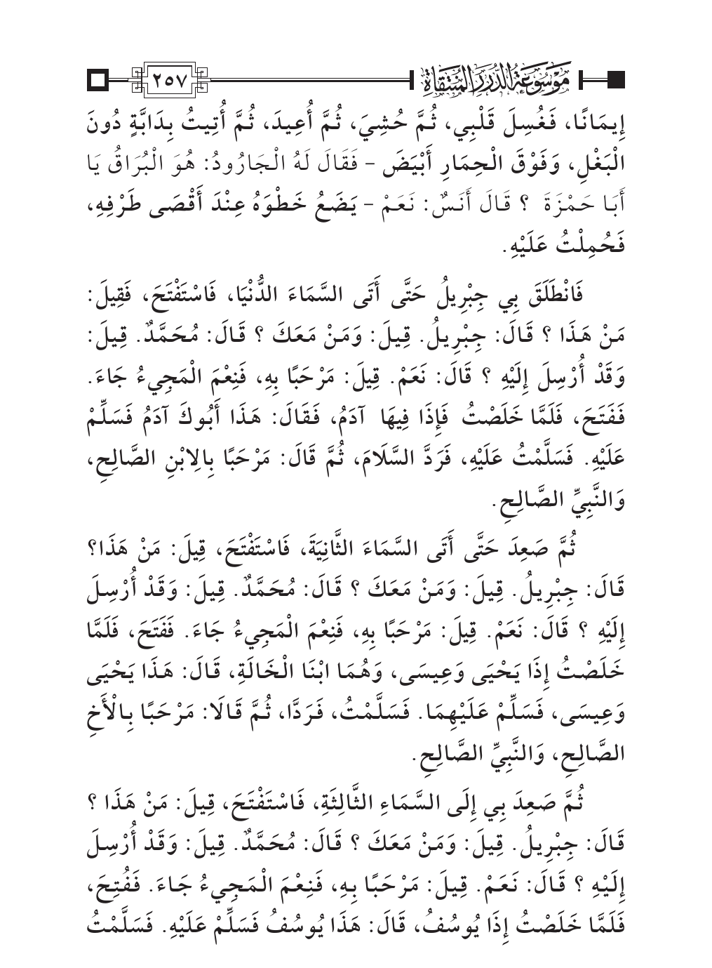 ثُمَّ صَعِدَ حَتَّى أَتَى السَّمَاءَ الثَّانِيَةَ، فَاسْتَفْتَحَ، قِيلَ: مَنْ هَذَا؟ قَالَ: جِبْرِيلُ. قِيلَ: وَمَنْ مَعَكَ؟ قَالَ: مُحَمَّدٌ. قِيلَ: وَقَدْ أُرْسِلَ إِلَيْهِ؟ قَالَ: نَعَمْ. قِيلَ: مَرْحَبًا بِهِ، فَنِعْمَ الْمَجِيءُ جَاءَ. فَفَتَحَ، فَلَمَّا خَلَصْتُ إِذَا يَحْيَى وَعِيسَى، وَهُمَا ابْنَا الْخَالَةِ، قَالَ: هَذَا يَحْيَى وَعِيسَى، فَسَلِّمْ عَلَيْهِمَا. فَسَلَّمْتُ، فَرَدَّا، ثُمَّ قَالَا: مَرْحَبًا بِالْأَخِ الصَّالِحِ، وَالنَّبِيِّ الصَّالِحِ.