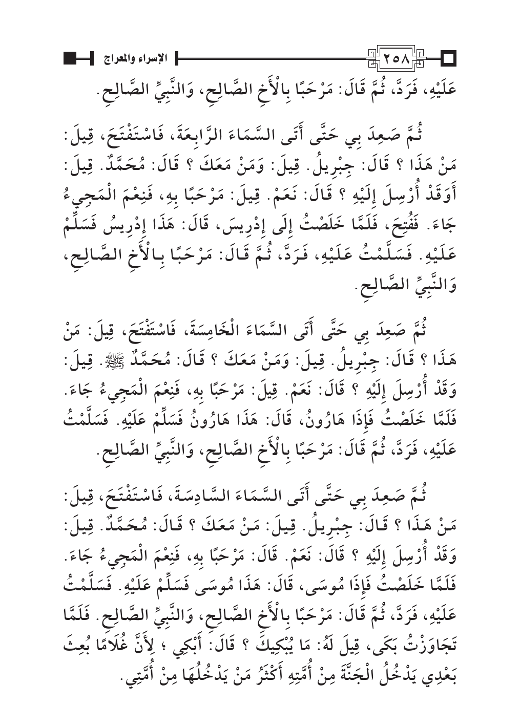 ثُمَّ صَعِدَ بِي حَتَّى أَتَى السَّمَاءَ السَّادِسَةَ، فَاسْتَفْتَحَ، قِيلَ: مَنْ هَذَا؟ قَالَ: جِبْرِيلُ. قِيلَ: مَنْ مَعَكَ؟ قَالَ: مُحَمَّدٌ. قِيلَ: وَقَدْ أُرْسِلَ إِلَيْهِ؟ قَالَ: نَعَمْ. قَالَ: مَرْحَبًا بِهِ، فَنِعْمَ الْمَجِيءُ جَاءَ. فَلَمَّا خَلَصْتُ فَإِذَا مُوسَى، قَالَ: هَذَا مُوسَى فَسَلِّمْ عَلَيْهِ. فَسَلَّمْتُ عَلَيْهِ، فَرَدَّ، ثُمَّ قَالَ: مَرْحَبًا بِالْأَخِ الصَّالِحِ، وَالنَّبِيِّ الصَّالِحِ. فَلَمَّا تَجَاوَزْتُ بَكَى، قِيلَ لَهُ: مَا يُبْكِيكَ؟ قَالَ: أَبْكِي؛ لِأَنَّ غُلَامًا بُعِثَ بَعْدِي يَدْخُلُ الْجَنَّةَ مِنْ أُمَّتِهِ أَكْثَرُ مَنْ يَدْخُلُهَا مِنْ أُمَّتِي.