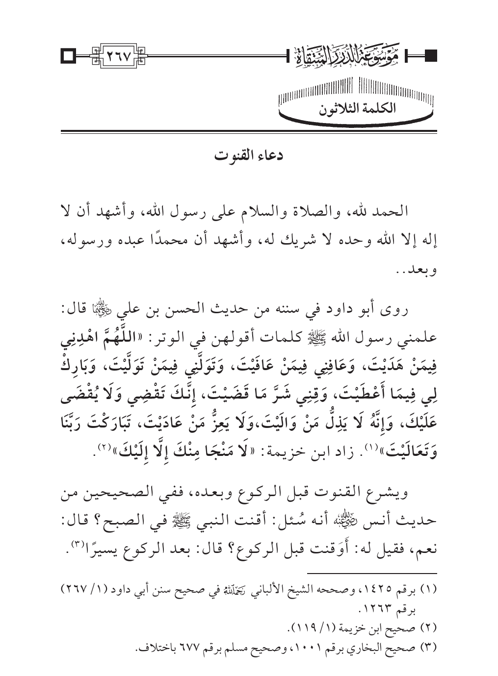 روى أبو داود في سننه من حديث الحسن بن علي - رضي الله عنهما - قال: علمني رسول الله - صلى الله عليه وسلم - كلمات أقولهن في الوتر: «اللَّهُمَّ اهْدِنِي فِيمَنْ هَدَيْتَ، وَعَافِنِي فِيمَنْ عَافَيْتَ، وَتَوَلَّنِي فِيمَنْ تَوَلَّيْتَ، وَبَارِكْ لِي فِيمَا أَعْطَيْتَ، وَقِنِي شَرَّ مَا قَضَيْتَ، إِنَّكَ تَقْضِي وَلَا يُقْضَى عَلَيْكَ، وَإِنَّهُ لَا يَذِلُّ مَنْ وَالَيْتَ، وَلَا يَعِزُّ مَنْ عَادَيْتَ، تَبَارَكْتَ رَبَّنَا وَتَعَالَيْتَ» (¬١). زاد ابن خزيمة: «لَا مَنْجَا مِنْكَ إِلَّا إِلَيْكَ» (¬٢).