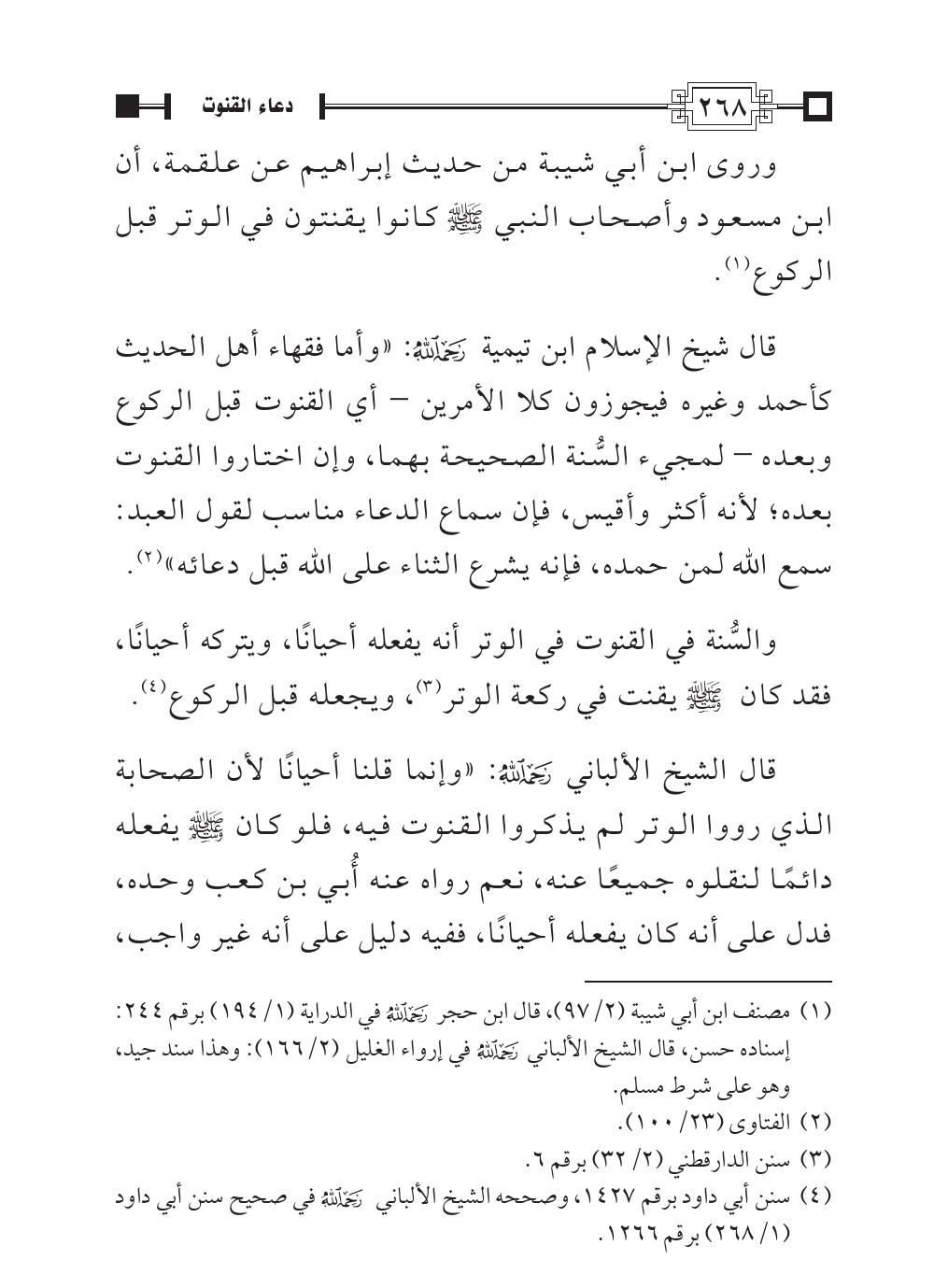 قال الشيخ الألباني - رحمه الله -: «وإنما قلنا أحيانًا لأن الصحابة الذي رووا الوتر لم يذكروا القنوت فيه، فلو كان - صلى الله عليه وسلم - يفعله دائمًا لنقلوه جميعًا عنه، نعم رواه عنه أُبي بن كعب وحده، فدل على أنه كان يفعله أحيانًا، ففيه دليل على أنه غير واجب،