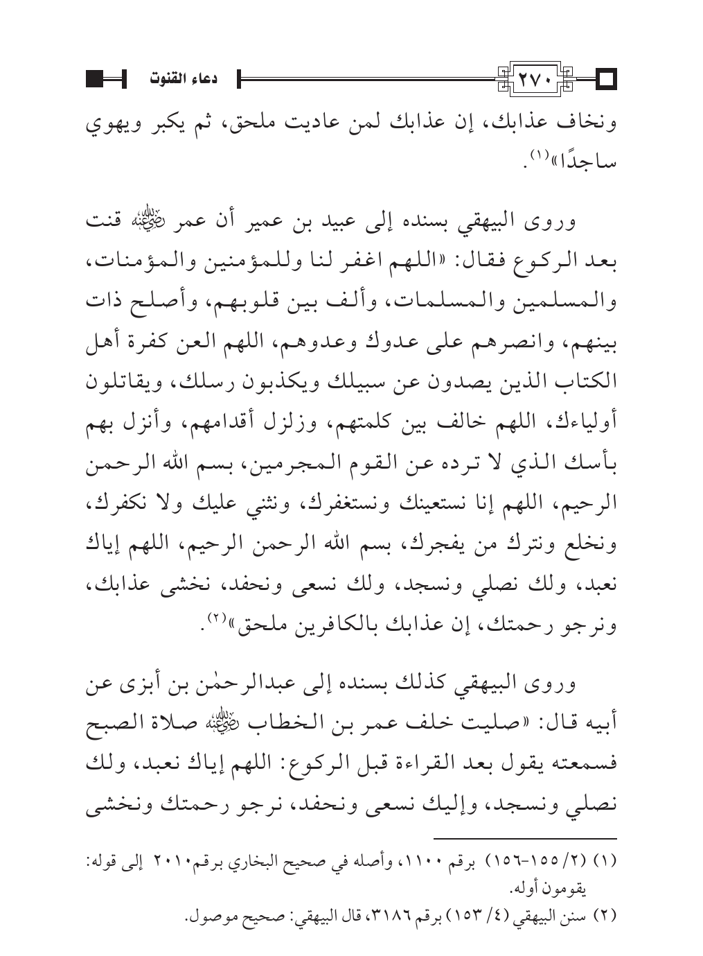 وروى البيهقي بسنده إلى عبيد بن عمير أن عمر - رضي الله عنه - قنت بعد الركوع فقال: «اللهم اغفر لنا وللمؤمنين والمؤمنات، والمسلمين والمسلمات، وألف بين قلوبهم، وأصلح ذات بينهم، وانصرهم على عدوك وعدوهم، اللهم العن كفرة أهل الكتاب الذين يصدون عن سبيلك ويكذبون رسلك، ويقاتلون أولياءك، اللهم خالف بين كلمتهم، وزلزل أقدامهم، وأنزل بهم بأسك الذي لا ترده عن القوم المجرمين، بسم الله الرحمن الرحيم، اللهم إنا نستعينك ونستغفرك، ونثني عليك ولا نكفرك، ونخلع ونترك من يفجرك، بسم الله الرحمن الرحيم، اللهم إياك نعبد، ولك نصلي ونسجد، ولك نسعى ونحفد، نخشى عذابك، ونرجو رحمتك، إن عذابك بالكافرين ملحق» (¬٢).