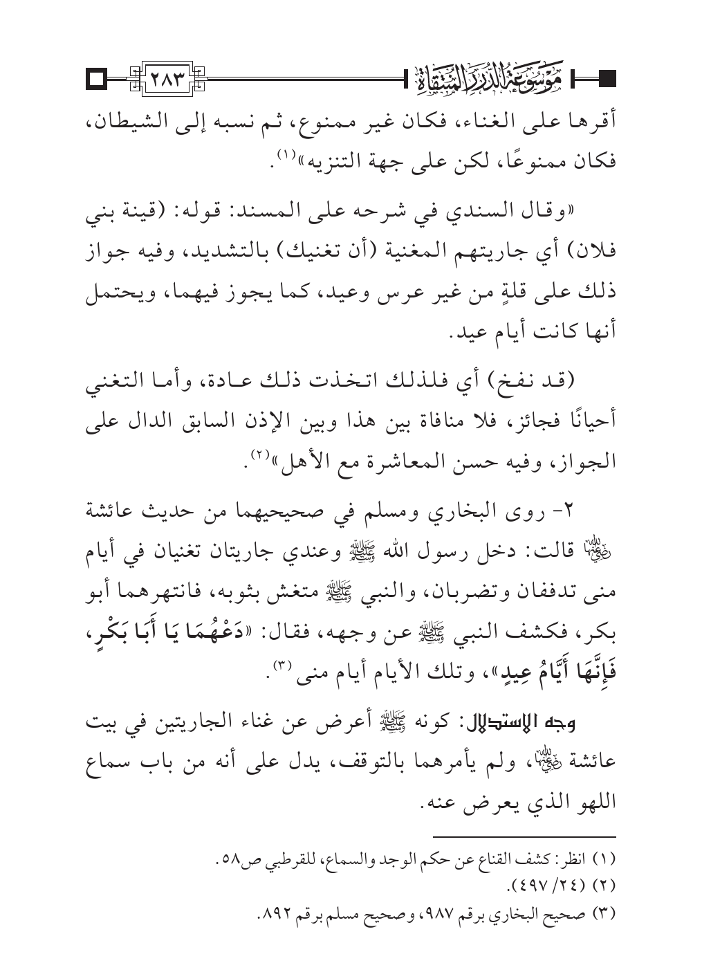 «وقال السندي في شرحه على المسند: قوله: (قينة بني فلان) أي جاريتهم المغنية (أن تغنيك) بالتشديد، وفيه جواز ذلك على قلةٍ من غير عرس وعيد، كما يجوز فيهما، ويحتمل أنها كانت أيام عيد.