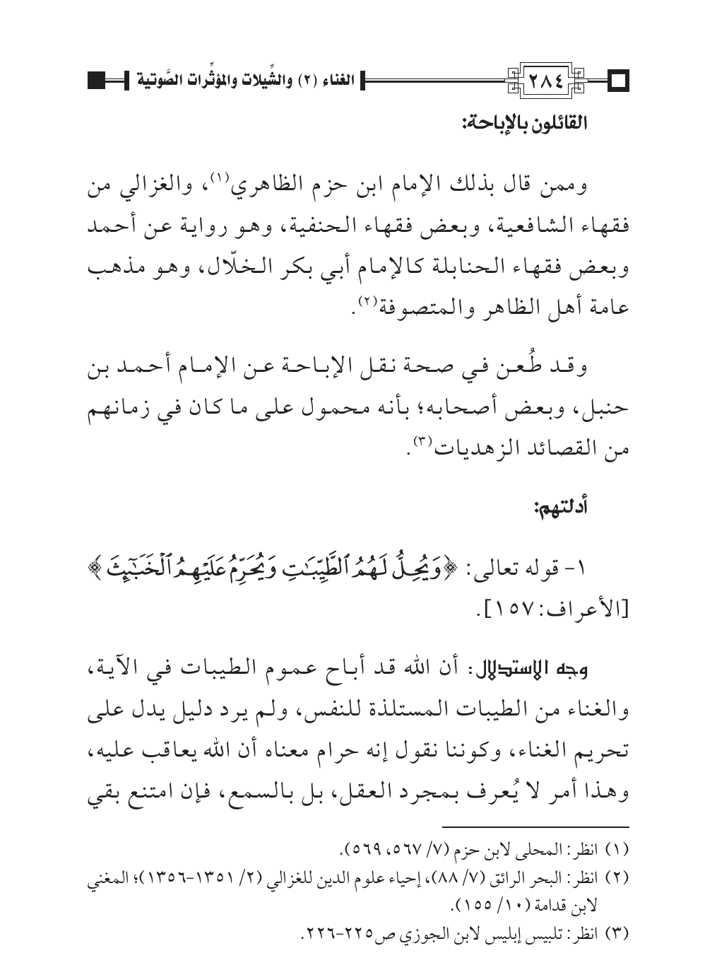 وجه الاستدلال: أن الله قد أباح عموم الطيبات في الآية، والغناء من الطيبات المستلذة للنفس، ولم يرد دليل يدل على تحريم الغناء، وكوننا نقول إنه حرام معناه أن الله يعاقب عليه، وهذا أمر لا يُعرف بمجرد العقل، بل بالسمع، فإن امتنع بقي