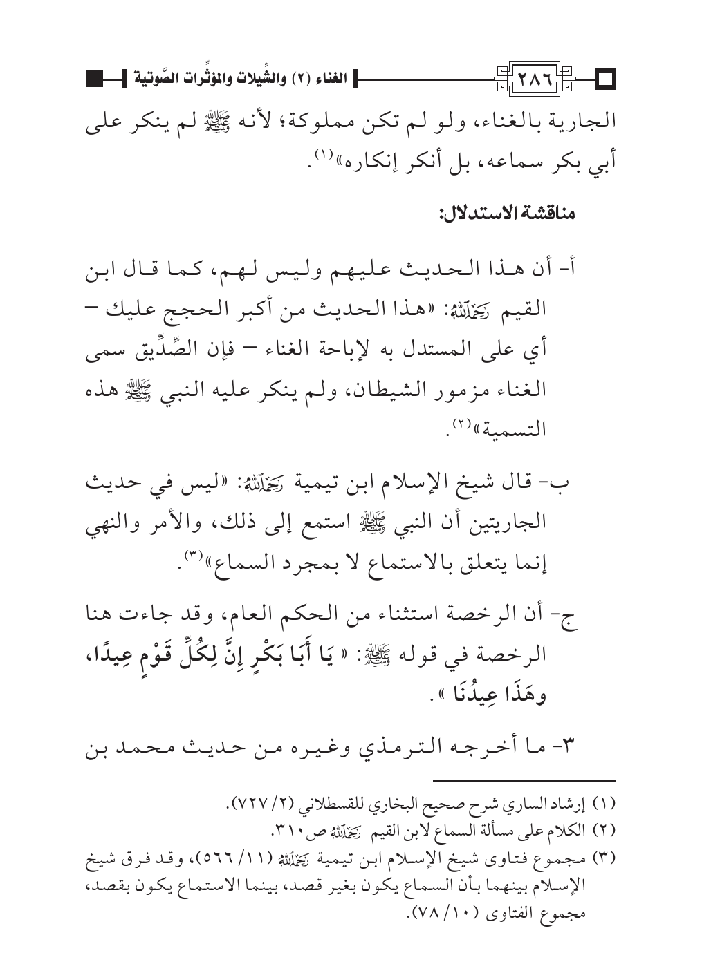 ب- قال شيخ الإسلام ابن تيمية - رحمه الله -: «ليس في حديث الجاريتين أن النبي - صلى الله عليه وسلم - استمع إلى ذلك، والأمر والنهي إنما يتعلق بالاستماع لا بمجرد السماع» (¬٣).