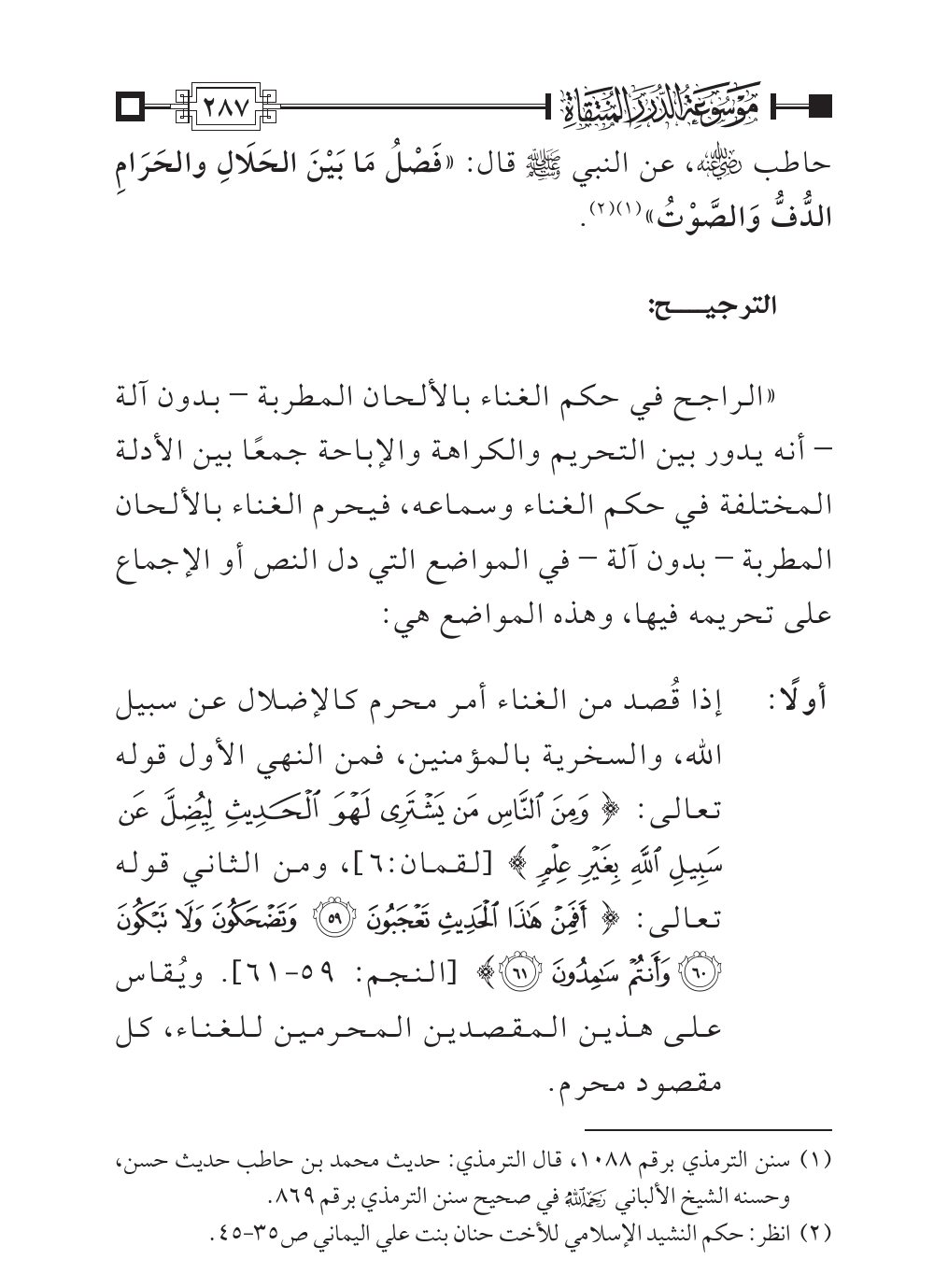 (¬٢). انظر: حكم النشيد الإسلامي للأخت حنان بنت علي اليماني ص ٣٥ - ٤٥.