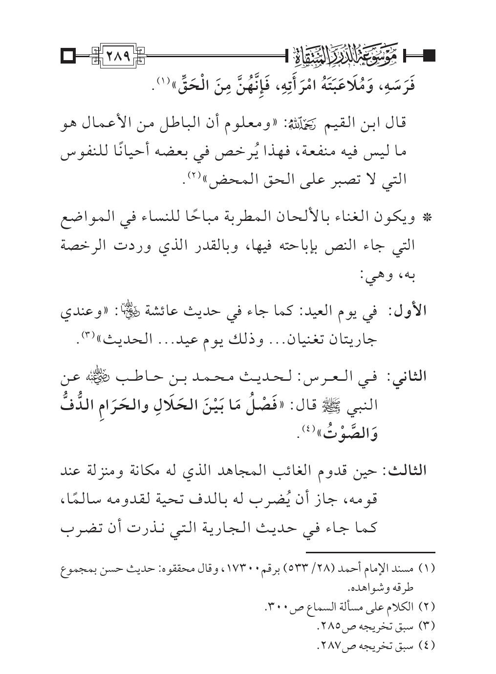 * ويكون الغناء بالألحان المطربة مباحًا للنساء في المواضع التي جاء النص بإباحته فيها، وبالقدر الذي وردت الرخصة به، وهي: