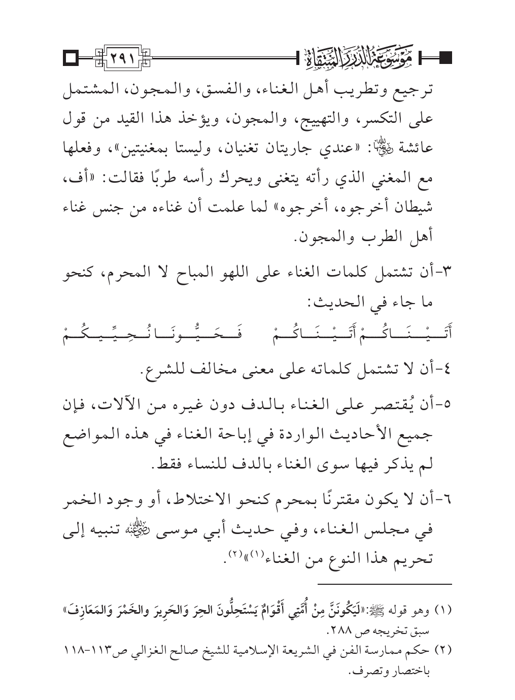 أن لا يكون مقترنًا بمحرم كنحو الاختلاط، أو وجود الخمر في مجلس الغناء، وفي حديث أبي موسى - رضي الله عنه - تنبيه إلى تحريم هذا النوع من الغناء (¬١)» (¬٢).