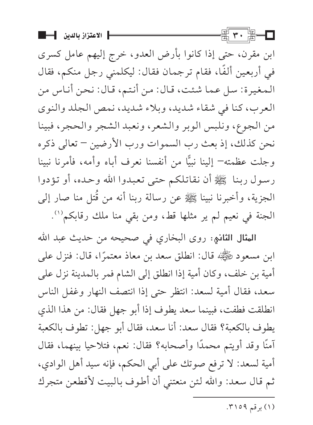 المثال الثاني: روى البخاري في صحيحه من حديث عبد الله ابن مسعود - رضي الله عنه - قال: انطلق سعد بن معاذ معتمرًا، قال: فنزل على أمية بن خلف، وكان أمية إذا انطلق إلى الشام فمر بالمدينة نزل على سعد، فقال أمية لسعد: انتظر حتى إذا انتصف النهار وغفل الناس انطلقت فطفت، فبينما سعد يطوف إذا أبو جهل فقال: من هذا الذي يطوف بالكعبة؟ فقال سعد: أنا سعد، فقال أبو جهل: تطوف بالكعبة آمنًا وقد أويتم محمدًا وأصحابه؟ فقال: نعم، فتلاحيا بينهما، فقال أمية لسعد: لا ترفع صوتك على أبي الحكم، فإنه سيد أهل الوادي، ثم قال سعد: والله لئن منعتني أن أطوف بالبيت لأقطعن متجرك