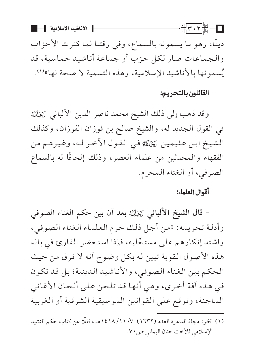 (¬١). انظر: مجلة الدعوة العدد (١٦٣٢) ٧/ ١١/١٤١٨ هـ، نقْلًا عن كتاب حكم النشيد الإسلامي للأخت حنان اليماني ص ٧٠.