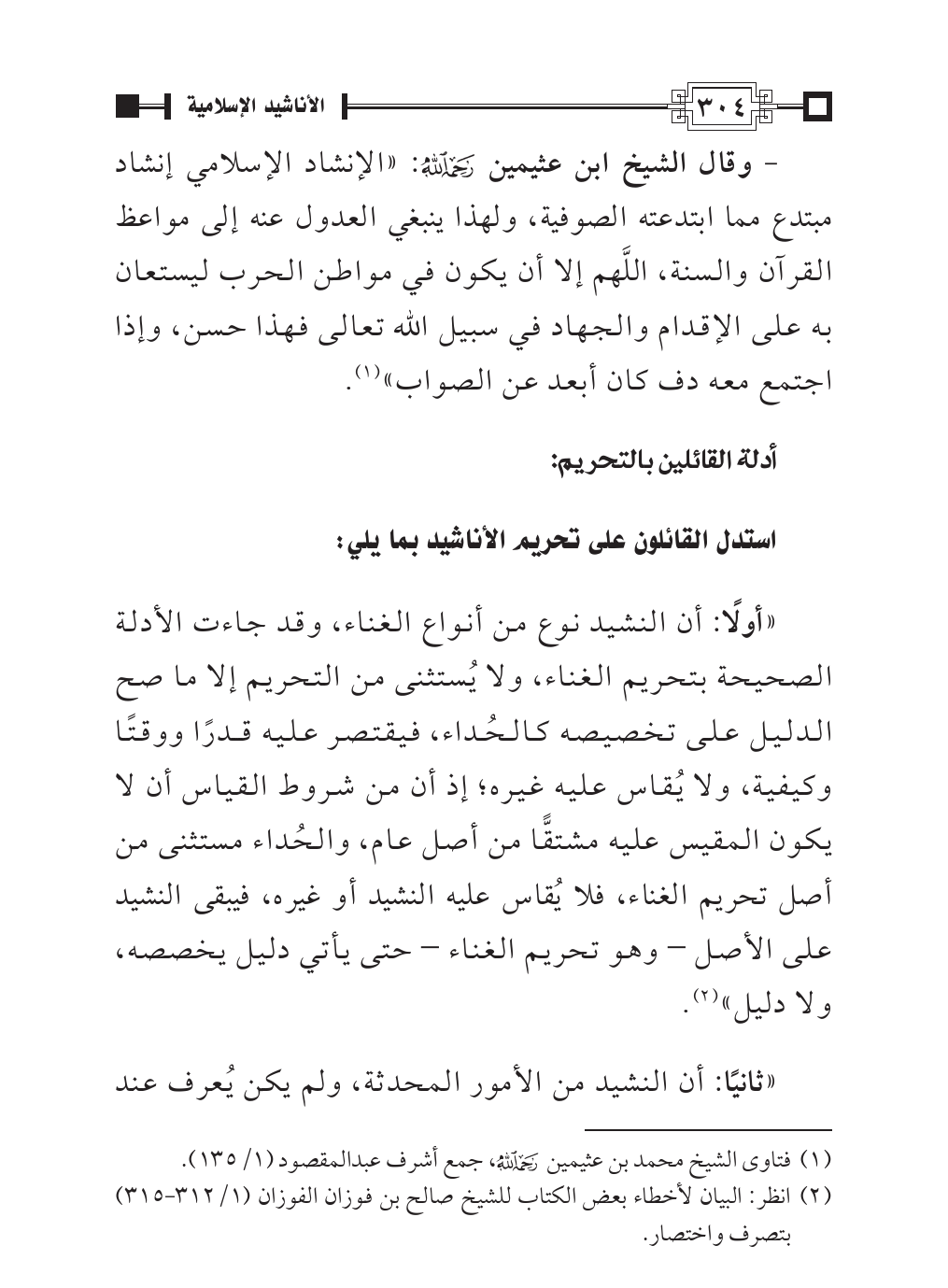 - وقال الشيخ ابن عثيمين - رحمه الله -: «الإنشاد الإسلامي إنشاد مبتدع مما ابتدعته الصوفية، ولهذا ينبغي العدول عنه إلى مواعظ القرآن والسنة، اللَّهم إلا أن يكون في مواطن الحرب ليستعان به على الإقدام والجهاد في سبيل الله تعالى فهذا حسن، وإذا اجتمع معه دف كان أبعد عن الصواب» (¬١).