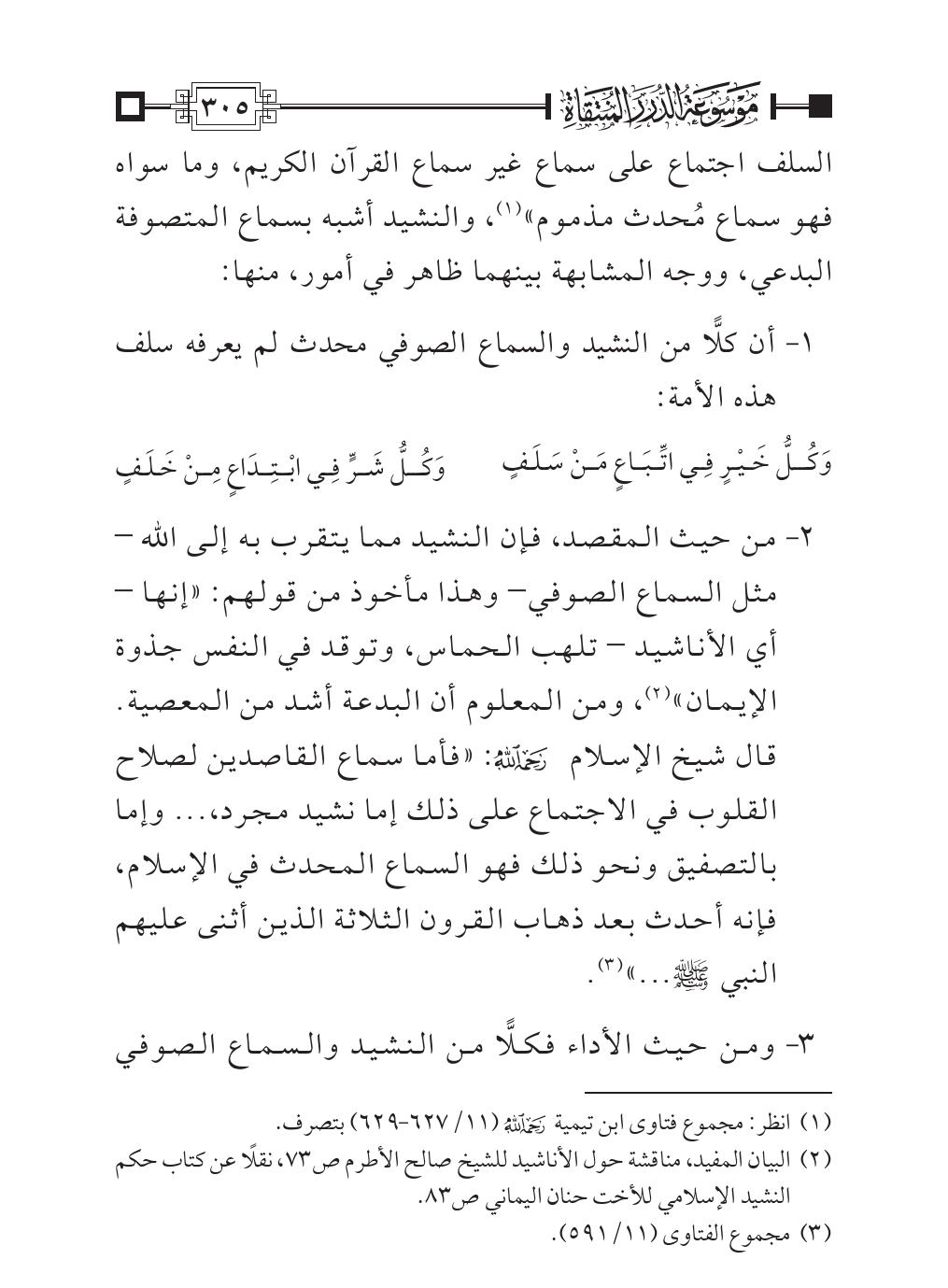 السلف اجتماع على سماع غير سماع القرآن الكريم، وما سواه فهو سماع مُحدث مذموم» (¬١)، والنشيد أشبه بسماع المتصوفة البدعي، ووجه المشابهة بينهما ظاهر في أمور، منها:
