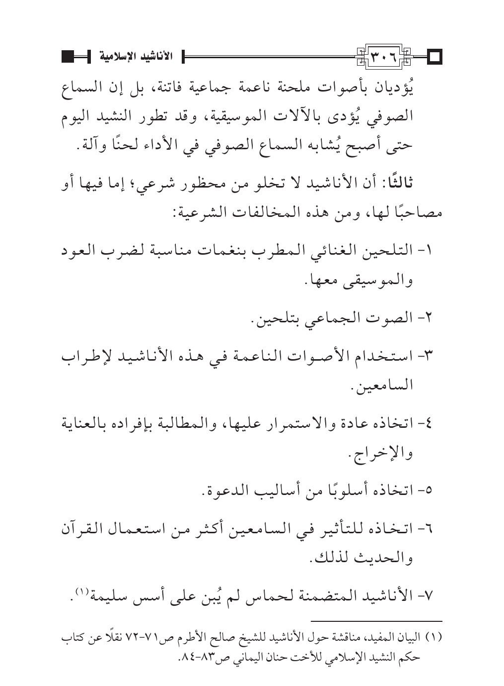 (¬١). البيان المفيد، مناقشة حول الأناشيد للشيخ صالح الأطرم ص ٧١ - ٧٢ نقلًا عن كتاب حكم النشيد الإسلامي للأخت حنان اليماني ص ٨٣ - ٨٤.