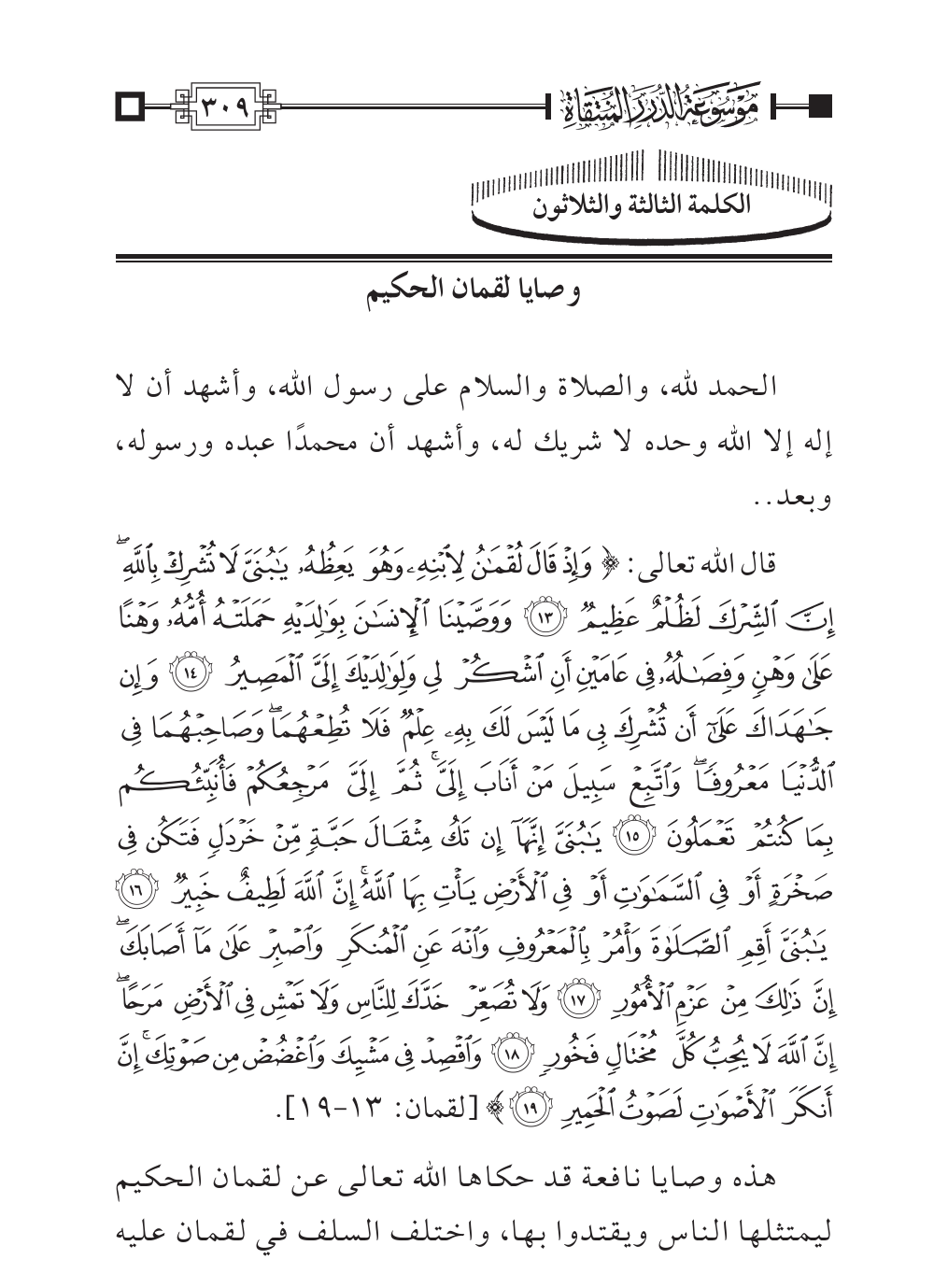 قال الله تعالى: {وَإِذْ قَالَ لُقْمَانُ لِابْنِهِ وَهُوَ يَعِظُهُ يَابُنَيَّ لَا تُشْرِكْ بِاللَّهِ إِنَّ الشِّرْكَ لَظُلْمٌ عَظِيمٌ (١٣) وَوَصَّيْنَا الْإِنْسَانَ بِوَالِدَيْهِ حَمَلَتْهُ أُمُّهُ وَهْنًا عَلَى وَهْنٍ وَفِصَالُهُ فِي عَامَيْنِ أَنِ اشْكُرْ لِي وَلِوَالِدَيْكَ إِلَيَّ الْمَصِيرُ (١٤) وَإِنْ جَاهَدَاكَ عَلَى أَنْ تُشْرِكَ بِي مَا لَيْسَ لَكَ بِهِ عِلْمٌ فَلَا تُطِعْهُمَا وَصَاحِبْهُمَا فِي الدُّنْيَا مَعْرُوفًا وَاتَّبِعْ سَبِيلَ مَنْ أَنَابَ إِلَيَّ ثُمَّ إِلَيَّ مَرْجِعُكُمْ فَأُنَبِّئُكُمْ بِمَا كُنْتُمْ تَعْمَلُونَ (١٥) يَابُنَيَّ إِنَّهَا إِنْ تَكُ مِثْقَالَ حَبَّةٍ مِنْ خَرْدَلٍ فَتَكُنْ فِي صَخْرَةٍ أَوْ فِي السَّمَاوَاتِ أَوْ فِي الْأَرْضِ يَأْتِ بِهَا اللَّهُ إِنَّ اللَّهَ لَطِيفٌ خَبِيرٌ (١٦) يَابُنَيَّ أَقِمِ الصَّلَاةَ وَأْمُرْ بِالْمَعْرُوفِ وَانْهَ عَنِ الْمُنْكَرِ وَاصْبِرْ عَلَى مَا أَصَابَكَ إِنَّ ذَلِكَ مِنْ عَزْمِ الْأُمُورِ (١٧) وَلَا تُصَعِّرْ خَدَّكَ لِلنَّاسِ وَلَا تَمْشِ فِي الْأَرْضِ مَرَحًا إِنَّ اللَّهَ لَا يُحِبُّ كُلَّ مُخْتَالٍ فَخُورٍ (١٨) وَاقْصِدْ فِي مَشْيِكَ وَاغْضُضْ مِنْ صَوْتِكَ إِنَّ أَنْكَرَ الْأَصْوَاتِ لَصَوْتُ الْحَمِيرِ (١٩)} [لقمان: ١٣ - ١٩].