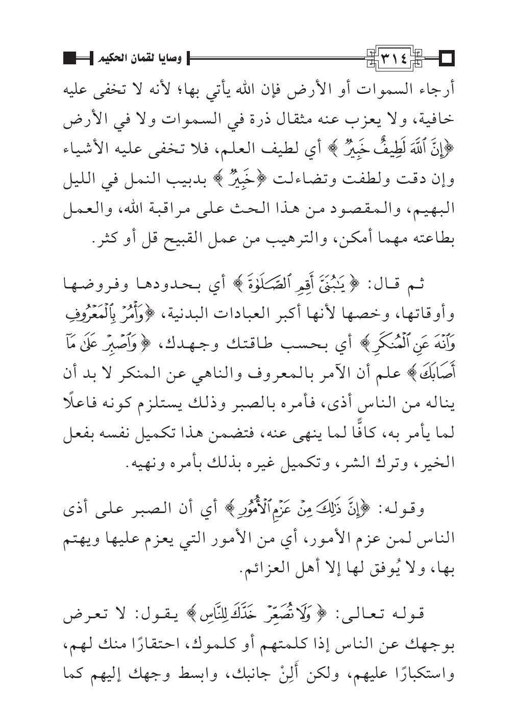 ثم قال: {يَابُنَيَّ أَقِمِ الصَّلَاةَ} أي بحدودها وفروضها وأوقاتها، وخصها لأنها أكبر العبادات البدنية، {وَأْمُرْ بِالْمَعْرُوفِ وَانْهَ عَنِ الْمُنْكَرِ} أي بحسب طاقتك وجهدك، {وَاصْبِرْ عَلَى مَا أَصَابَكَ} علم أن الآمر بالمعروف والناهي عن المنكر لا بد أن يناله من الناس أذى، فأمره بالصبر وذلك يستلزم كونه فاعلًا لما يأمر به، كافًّا لما ينهى عنه، فتضمن هذا تكميل نفسه بفعل الخير، وترك الشر، وتكميل غيره بذلك بأمره ونهيه.