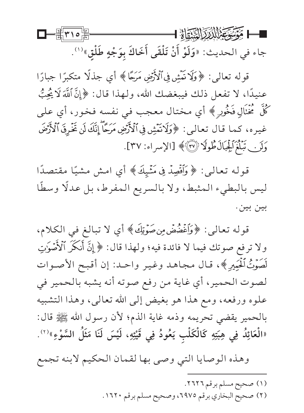 قوله تعالى: {وَاغْضُضْ مِنْ صَوْتِكَ} أي لا تبالغ في الكلام، ولا ترفع صوتك فيما لا فائدة فيه؛ ولهذا قال: {إِنَّ أَنْكَرَ الْأَصْوَاتِ لَصَوْتُ الْحَمِيرِ}، قال مجاهد وغير واحد: إن أقبح الأصوات لصوت الحمير، أي غاية من رفع صوته أنه يشبه بالحمير في علوه ورفعه، ومع هذا هو بغيض إلى الله تعالى، وهذا التشبيه بالحمير يقضي تحريمه وذمه غاية الذم؛ لأن رسول الله - صلى الله عليه وسلم - قال: «الْعَائِدُ فِي هِبَتِهِ كَالْكَلْبِ يَعُودُ فِي قَيْئِهِ، لَيْسَ لَنَا مَثَلُ السَّوْءِ» (¬٢).