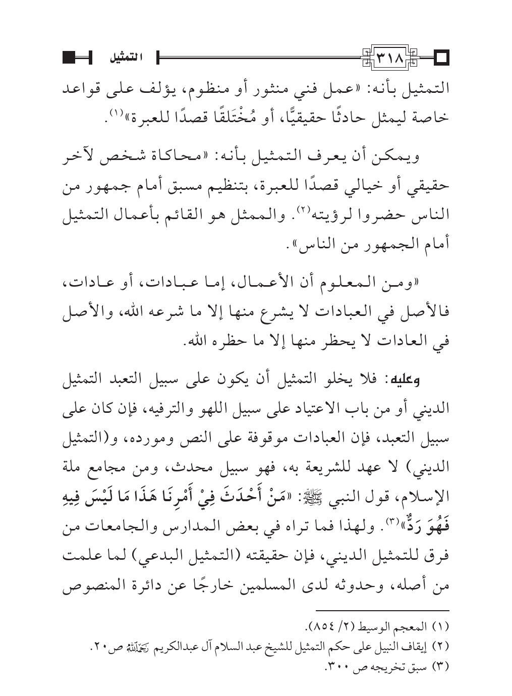 (¬٢). إيقاف النبيل على حكم التمثيل للشيخ عبد السلام آل عبدالكريم ٤ ص ٢٠.
