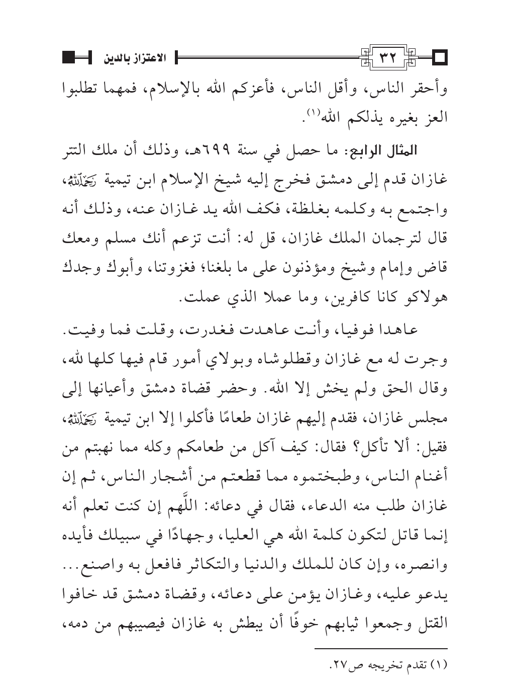 المثال الرابع: ما حصل في سنة ٦٩٩ هـ، وذلك أن ملك التتر غازان قدم إلى دمشق فخرج إليه شيخ الإسلام ابن تيمية - رحمه الله -، واجتمع به وكلمه بغلظة، فكف الله يد غازان عنه، وذلك أنه قال لترجمان الملك غازان، قل له: أنت تزعم أنك مسلم ومعك قاض وإمام وشيخ ومؤذنون على ما بلغنا؛ فغزوتنا، وأبوك وجدك هولاكو كانا كافرين، وما عملا الذي عملت.