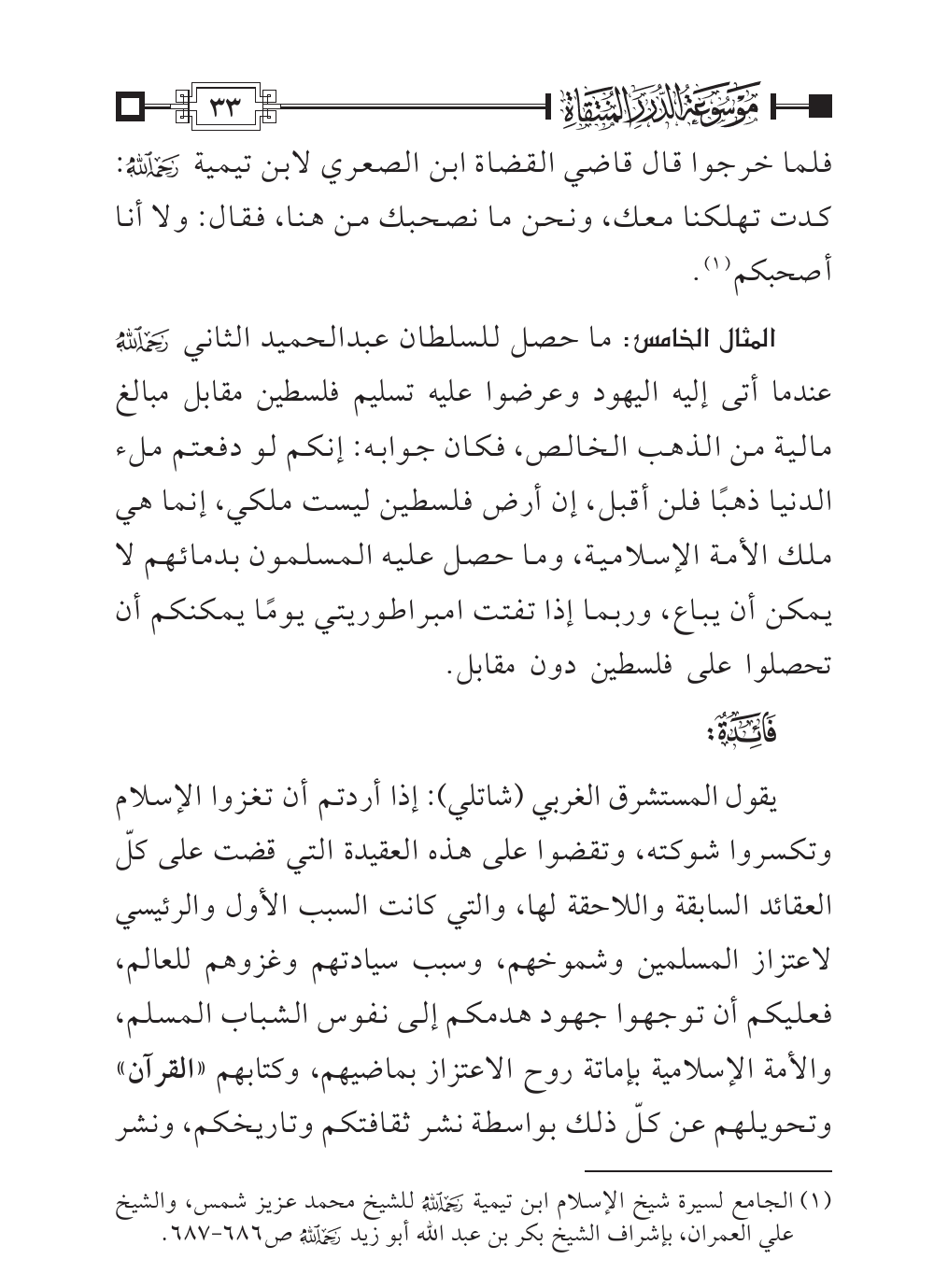 (¬١). الجامع لسيرة شيخ الإسلام ابن تيمية - رحمه الله - للشيخ محمد عزيز شمس، والشيخ علي العمران، بإشراف الشيخ بكر بن عبد الله أبو زيد - رحمه الله - ص ٦٨٦ - ٦٨٧.