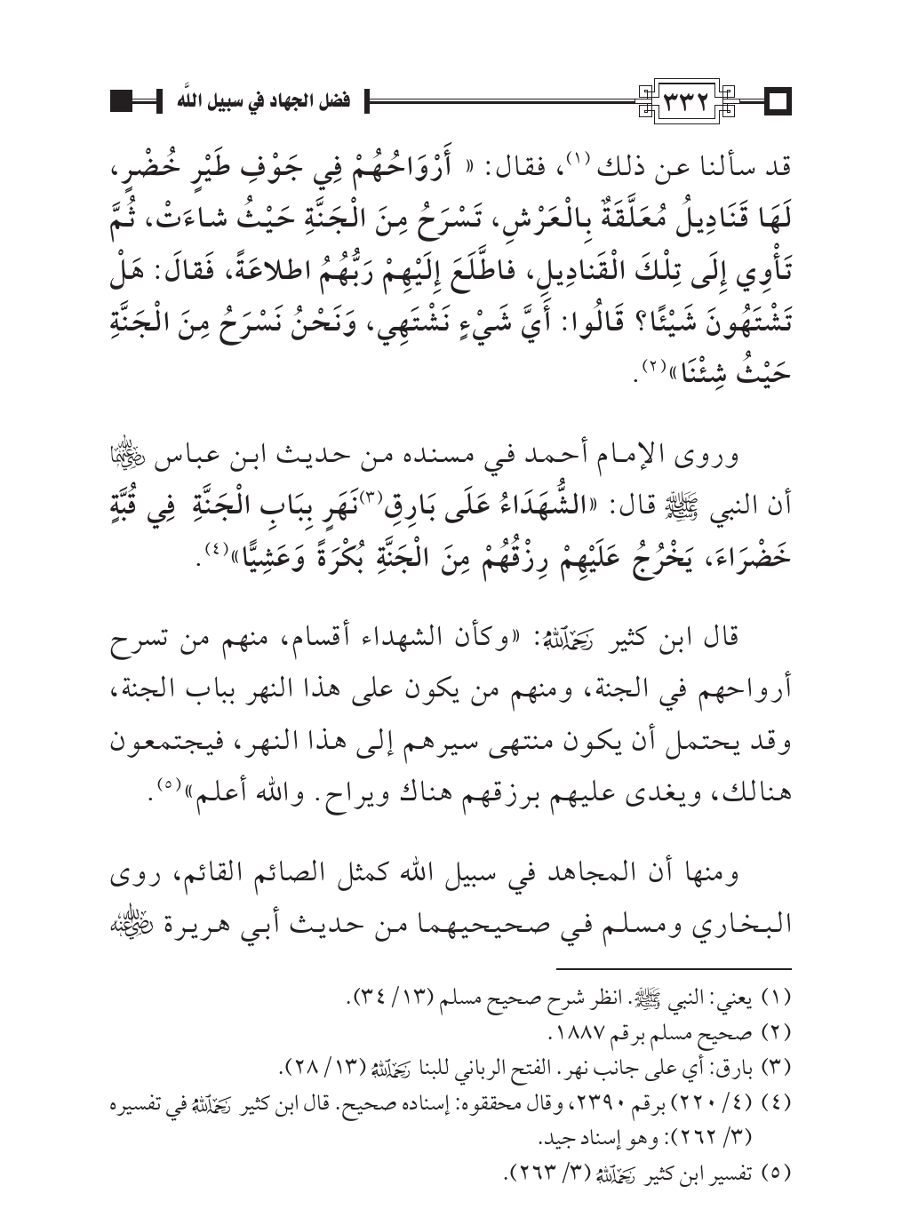 قال ابن كثير - رحمه الله -: «وكأن الشهداء أقسام، منهم من تسرح أرواحهم في الجنة، ومنهم من يكون على هذا النهر بباب الجنة، وقد يحتمل أن يكون منتهى سيرهم إلى هذا النهر، فيجتمعون هنالك، ويغدى عليهم برزقهم هناك ويراح. والله أعلم» (¬٥).