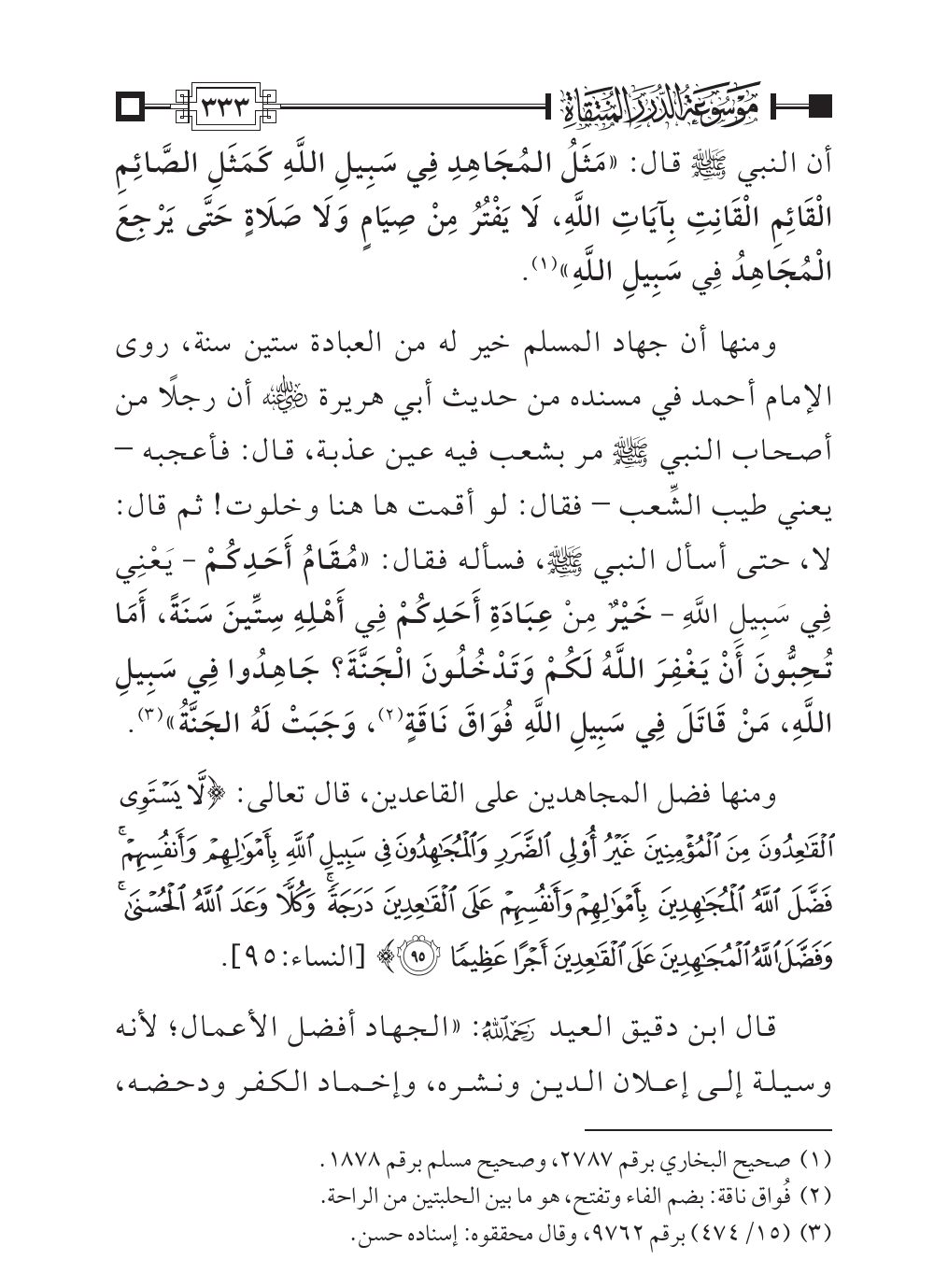 قال ابن دقيق العيد - رحمه الله -: «الجهاد أفضل الأعمال؛ لأنه وسيلة إلى إعلان الدين ونشره، وإخماد الكفر ودحضه،