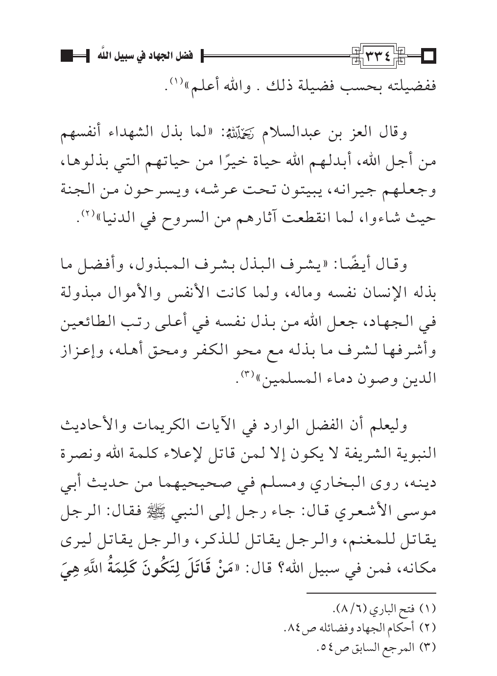وقال أيضًا: «يشرف البذل بشرف المبذول، وأفضل ما بذله الإنسان نفسه وماله، ولما كانت الأنفس والأموال مبذولة في الجهاد، جعل الله من بذل نفسه في أعلى رتب الطائعين وأشرفها لشرف ما بذله مع محو الكفر ومحق أهله، وإعزاز الدين وصون دماء المسلمين» (¬٣).